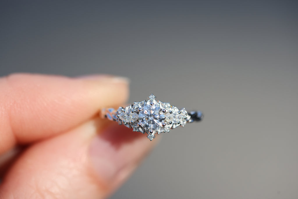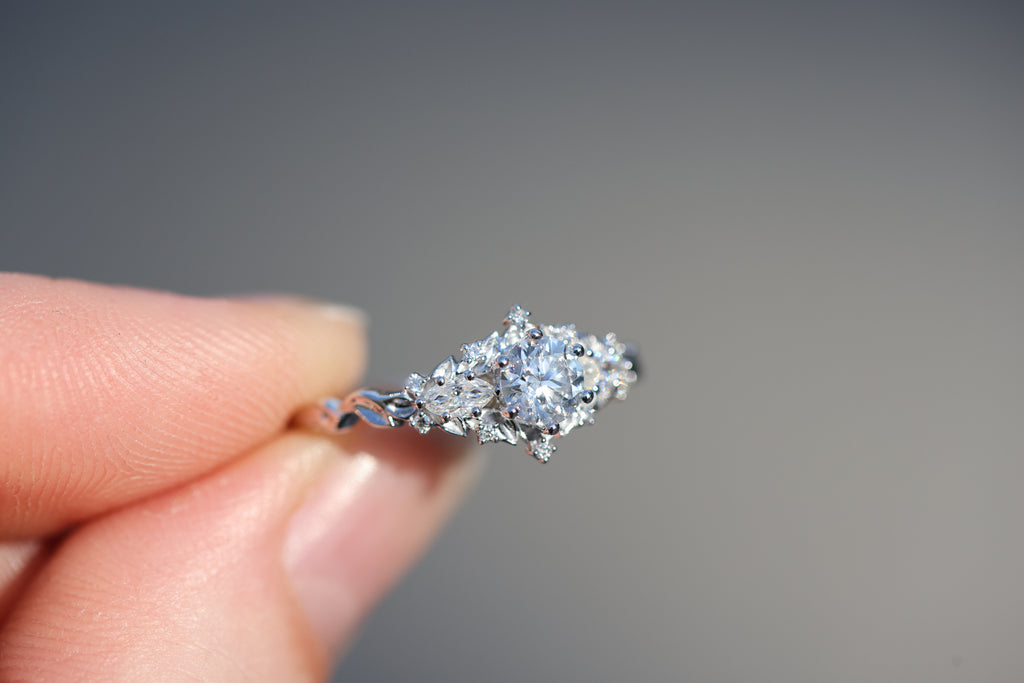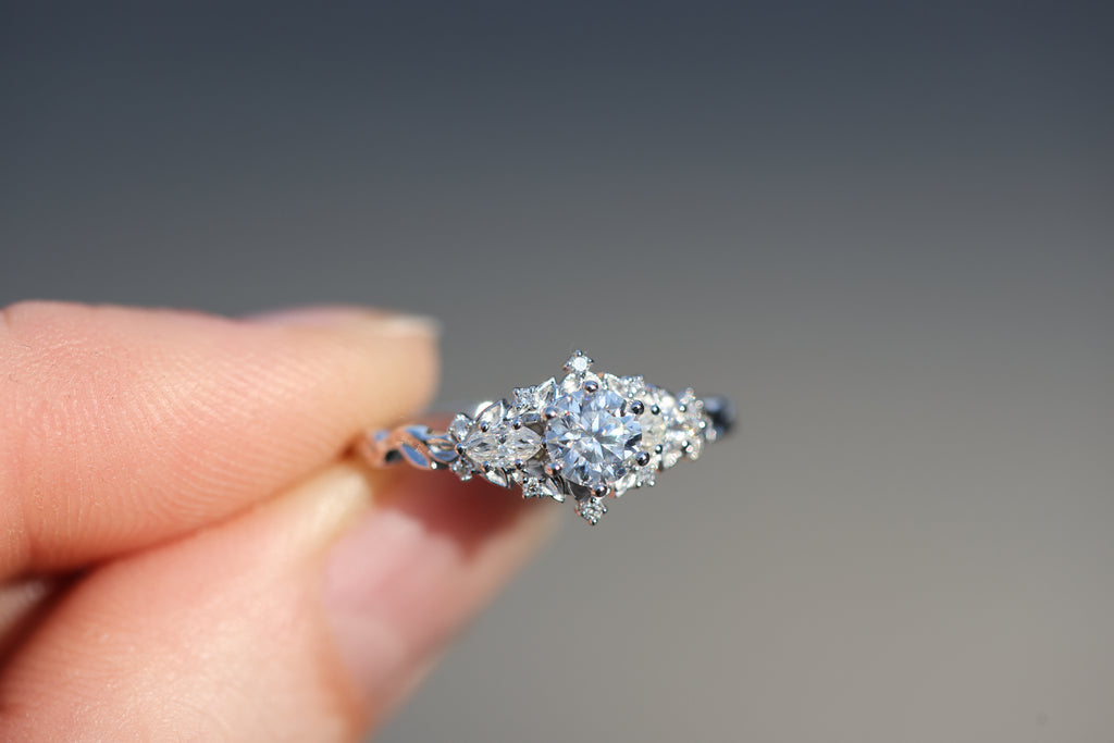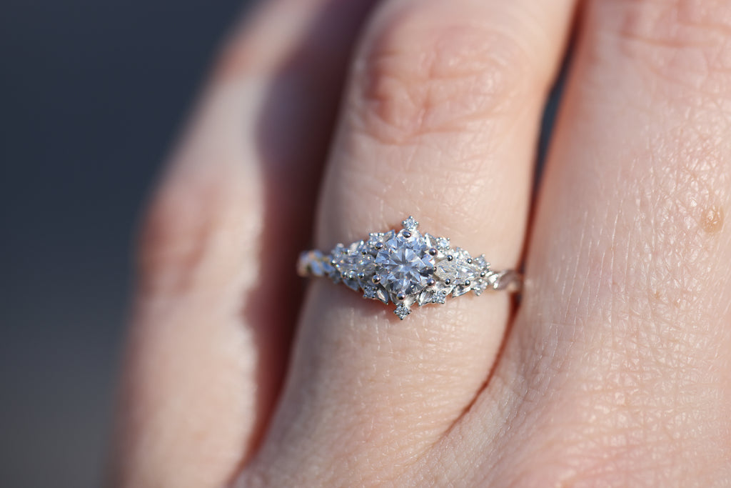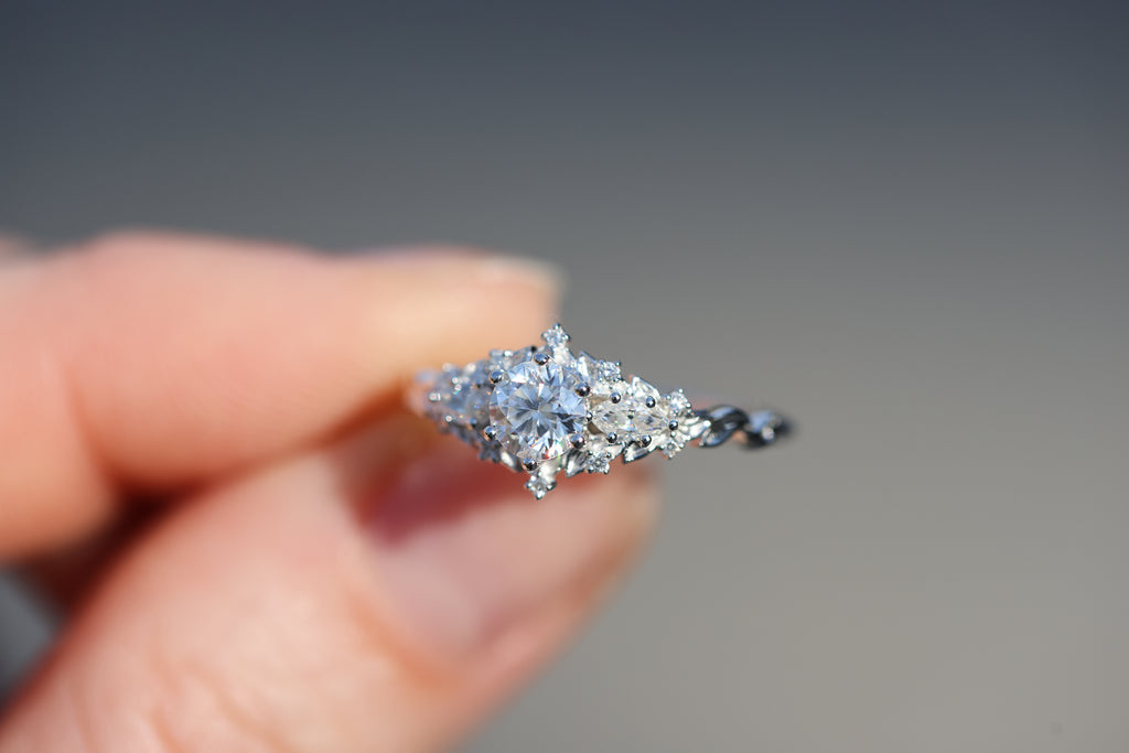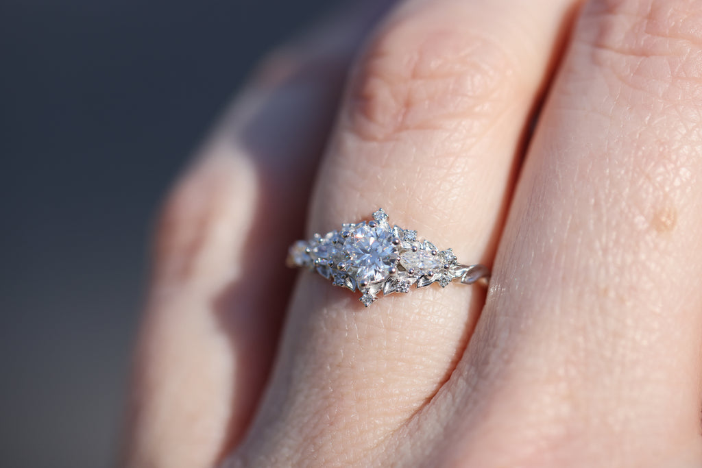 READY TO SHIP- size 7.25, 14k white gold Briar Rose Three Stone