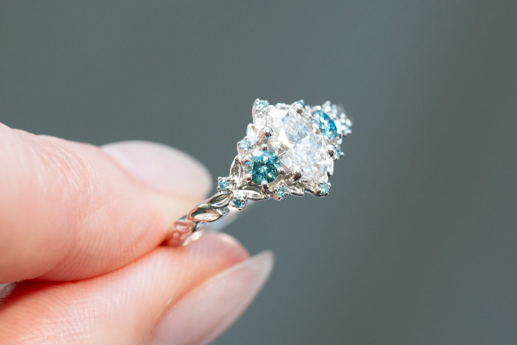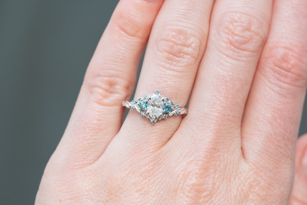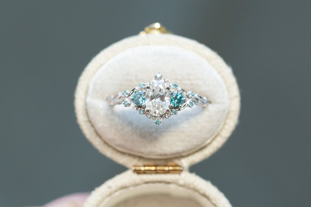 -Side/Accents Stones: 3mm round aqua irradiated diamond, 1mm round aqua irradiated diamond