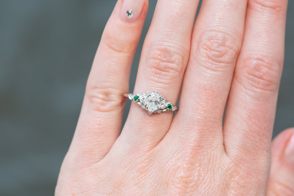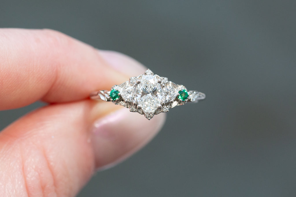 -Side/Accents Stones: 3mm trillion lab diamond, 2mm round lab emerald, 1mm lab diamond