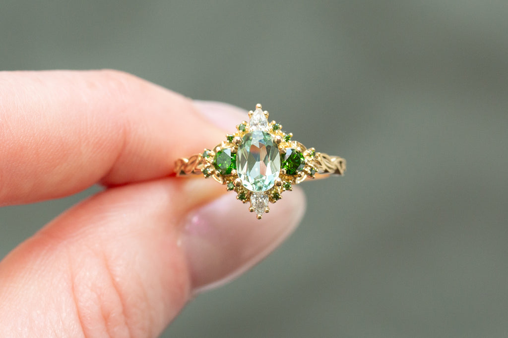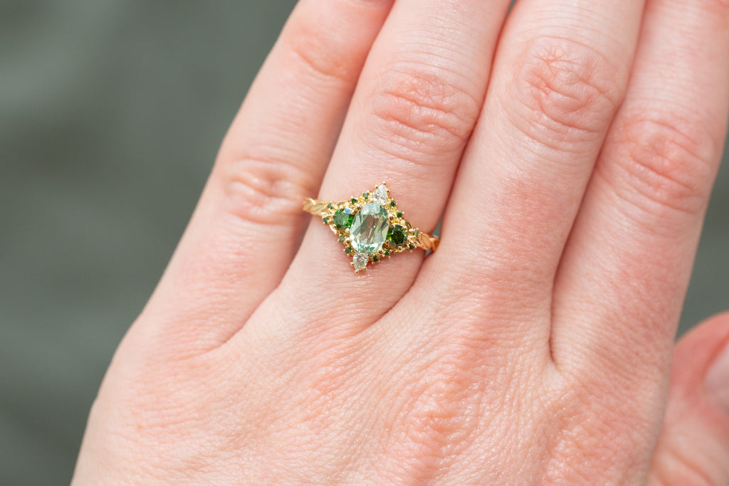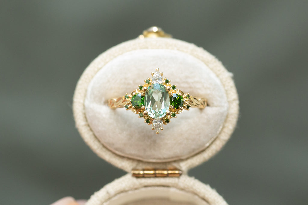 -Side/Accents Stones: 3mm round dark green irradiated diamond, 3x2mm pear lab diamond, 1mm lab diamond