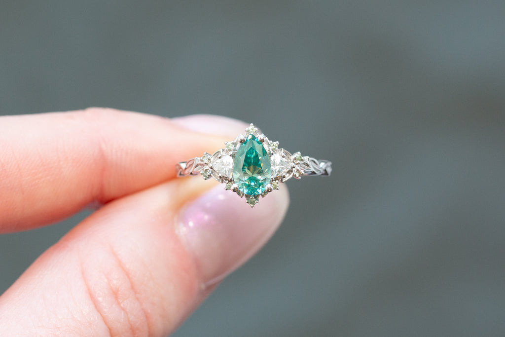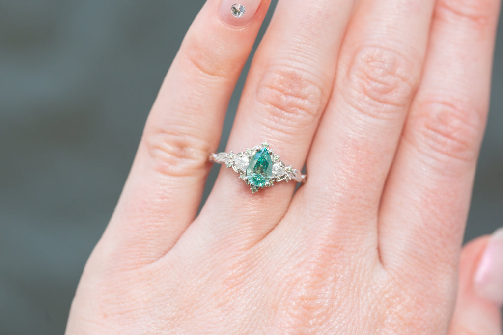 -Side/Accents Stones: 3mm trillion lab diamond, 1mm mint irradiated diamond