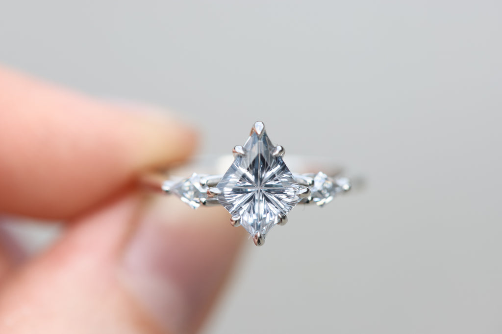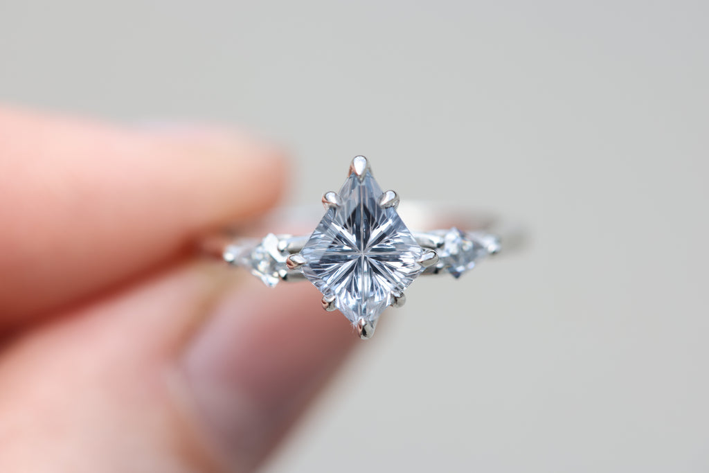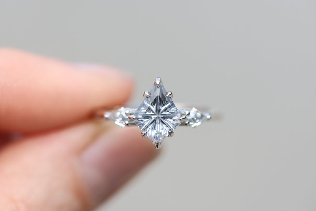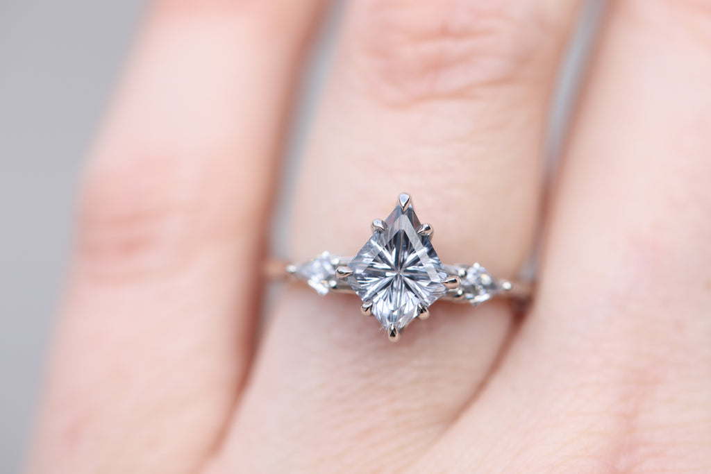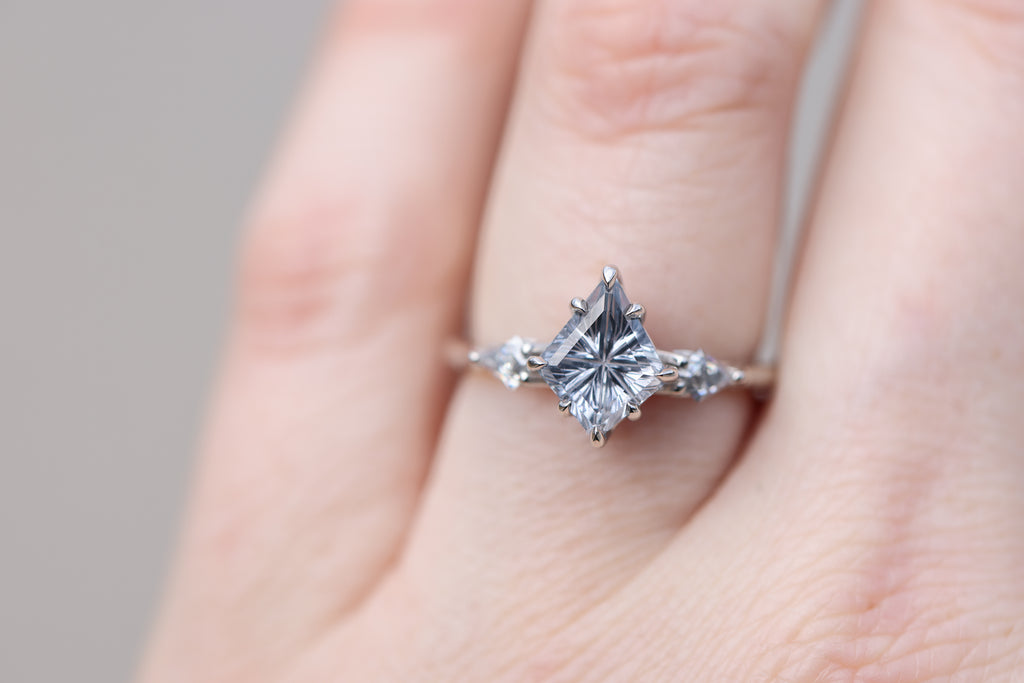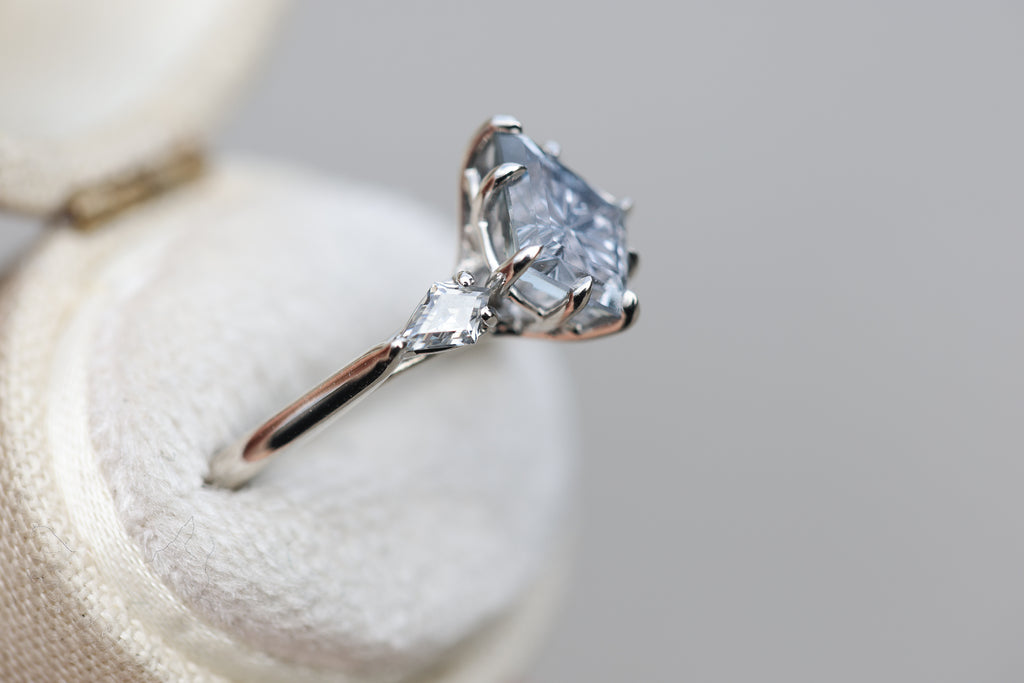 - 1.72ct 9.4x7.7mm kite cut starbite center, silver/grey with a hint of lavender unheated