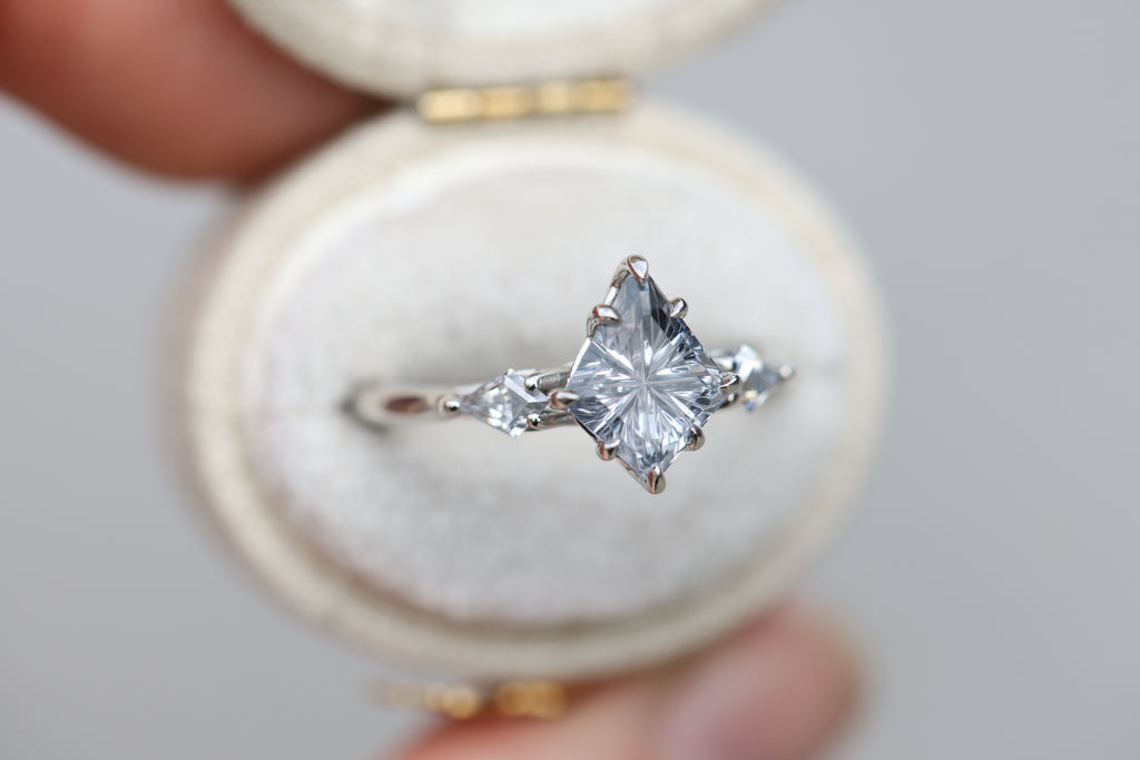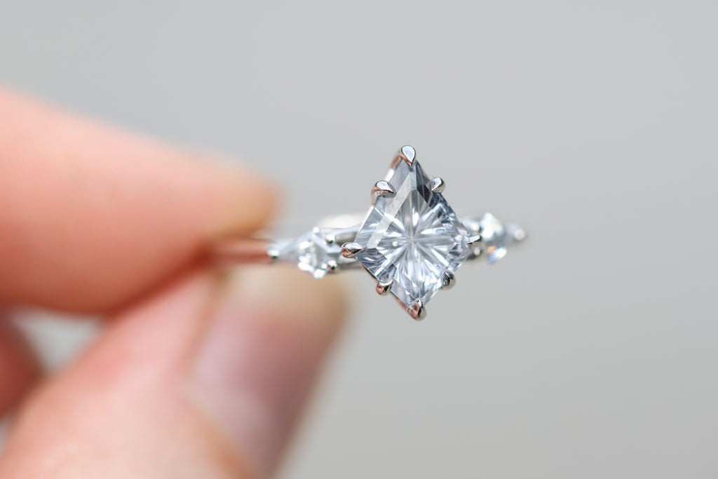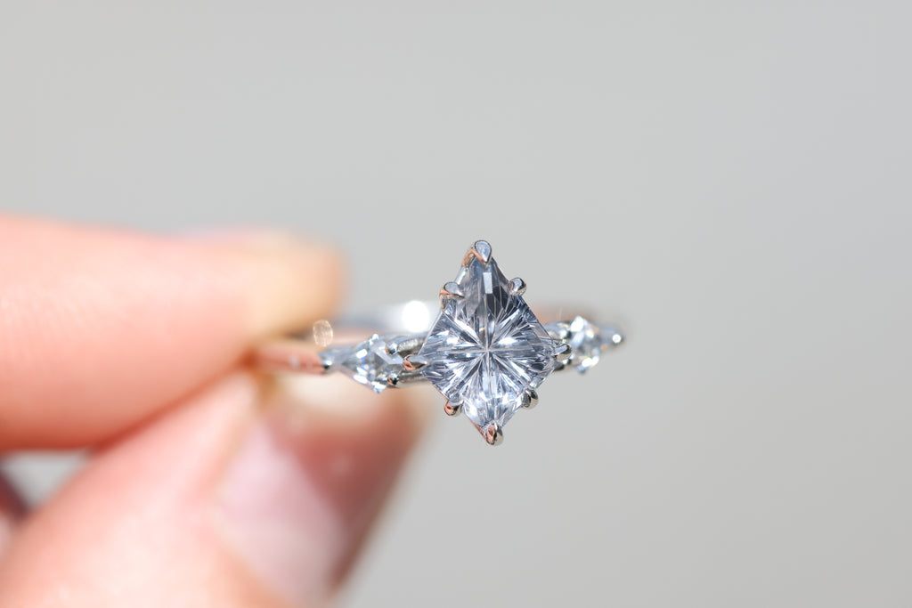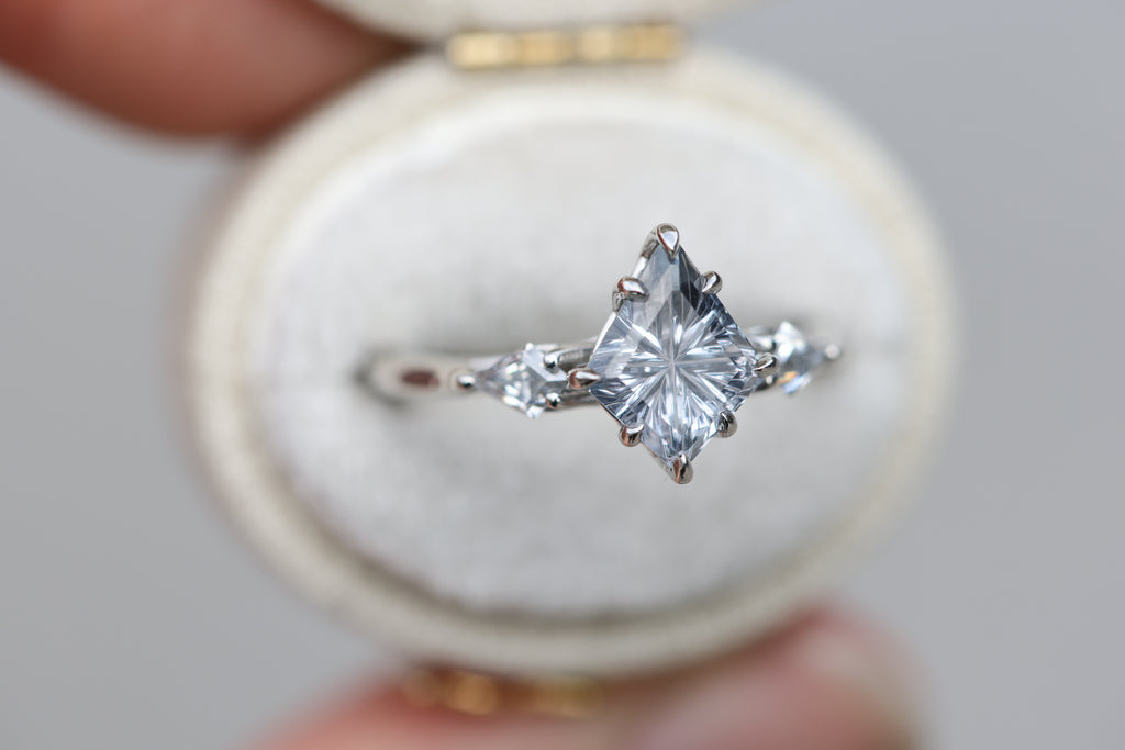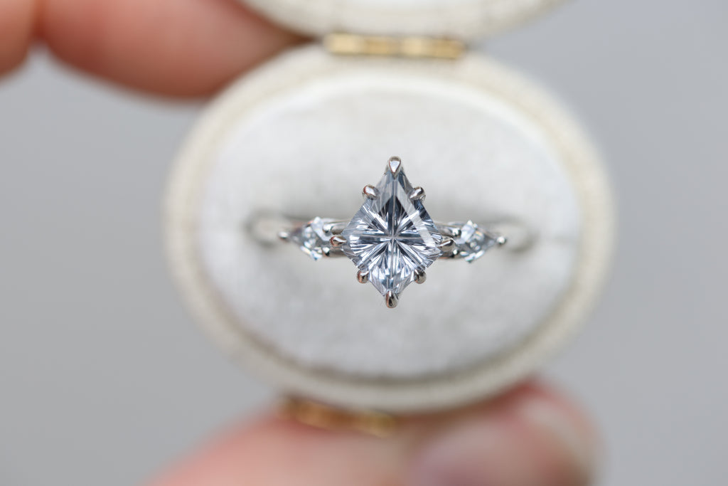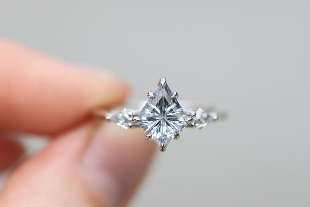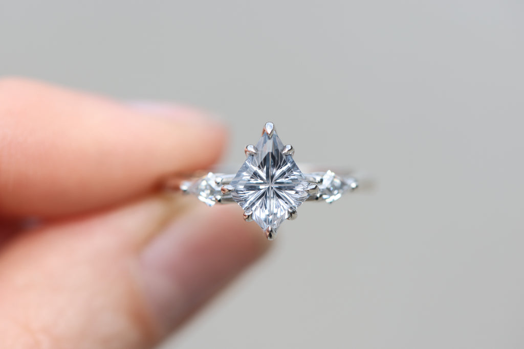 - 1.72ct 9.4x7.7mm kite cut starbite center, silver/grey with a hint of lavender unheated