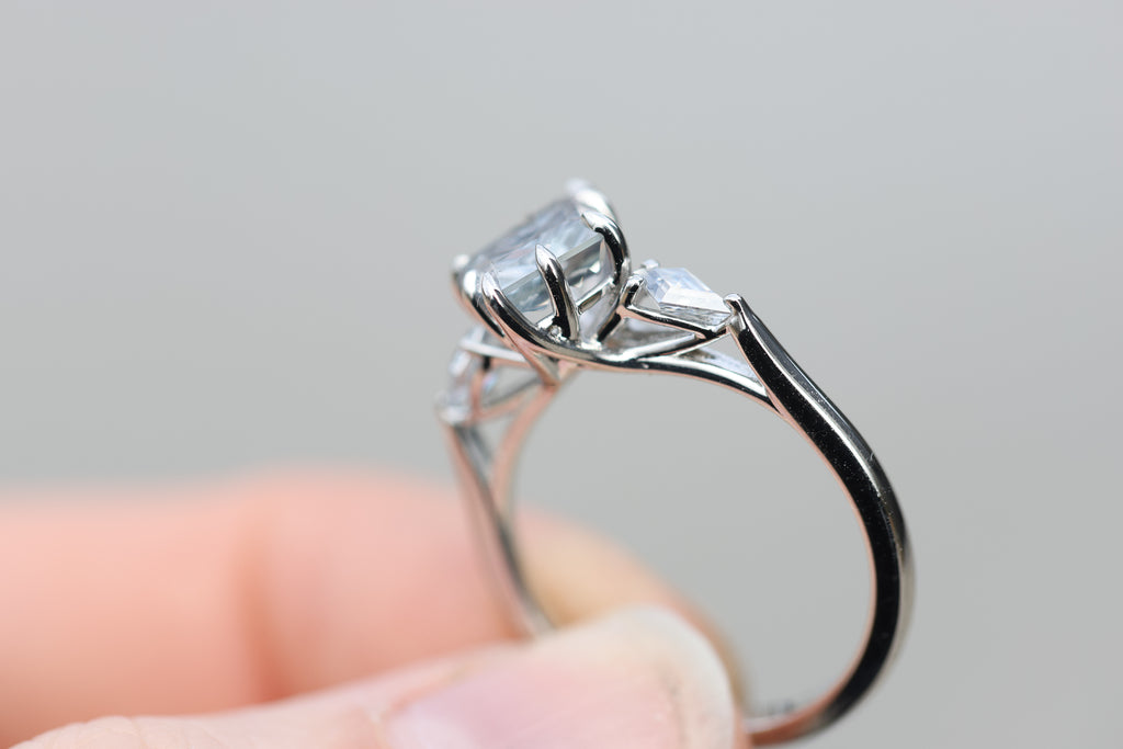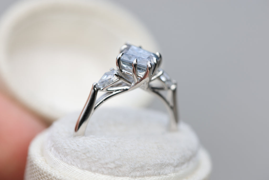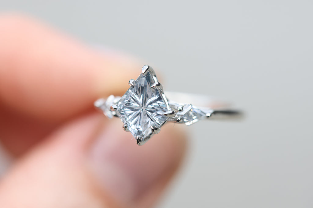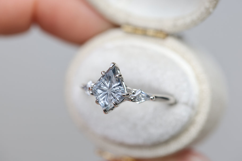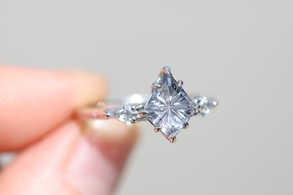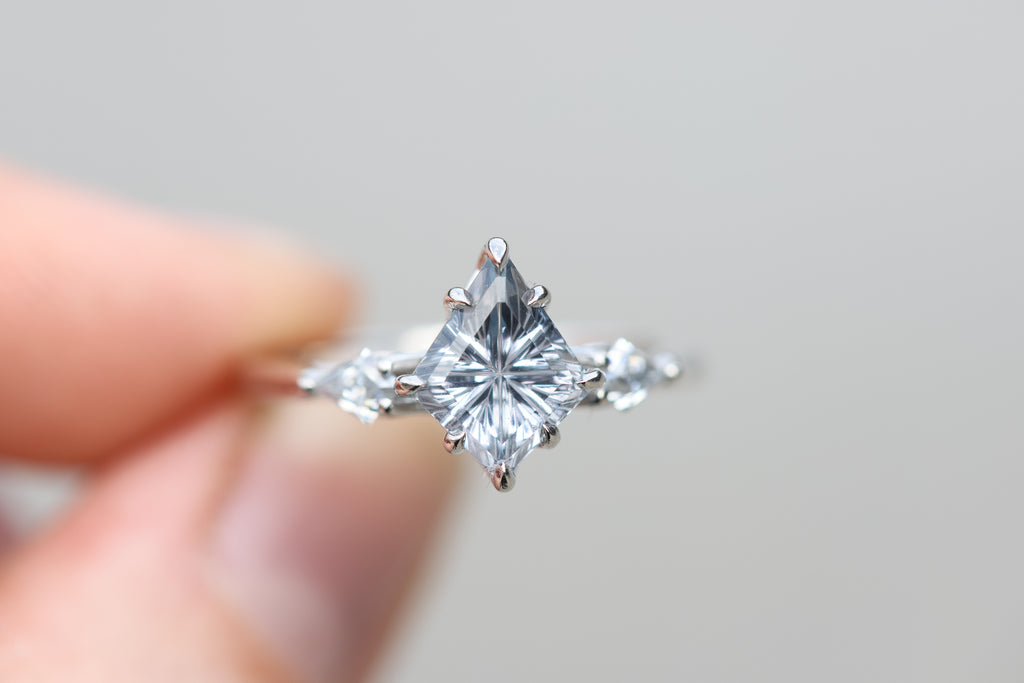 - 1.72ct 9.4x7.7mm kite cut starbite center, silver/grey with a hint of lavender unheated