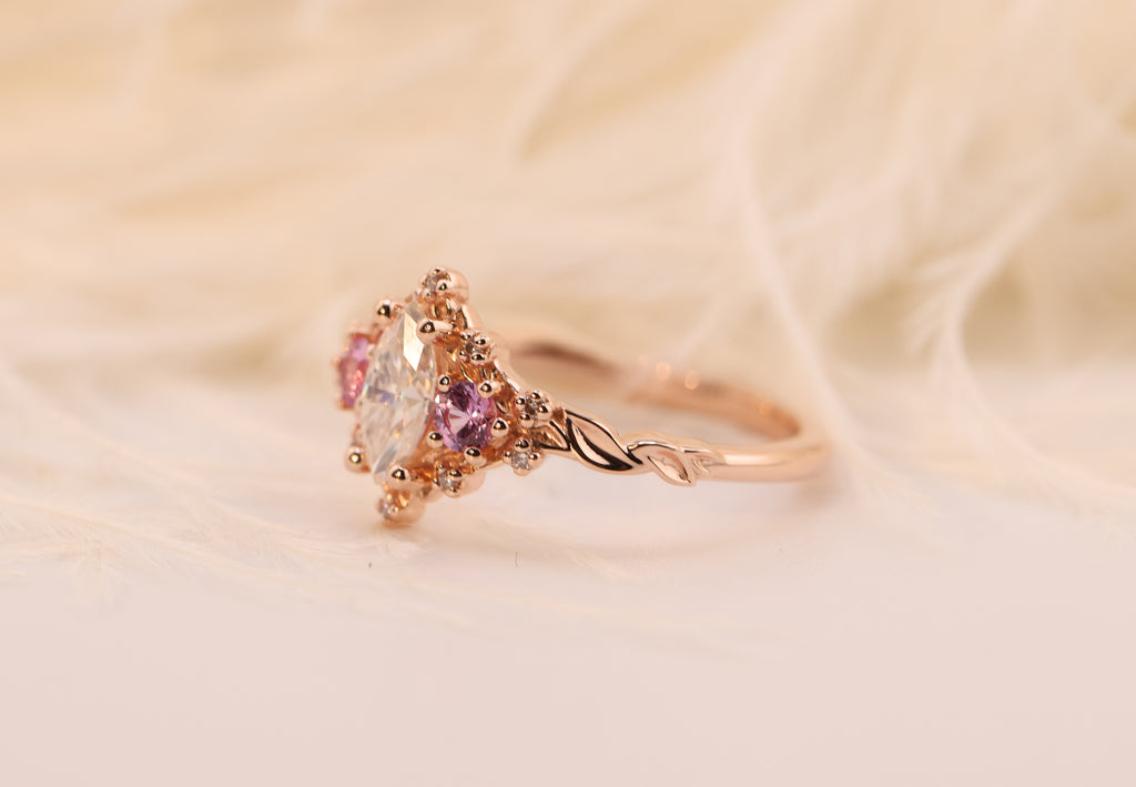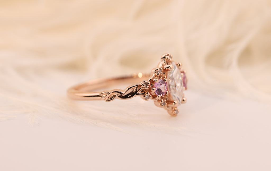 -Side/Accents: 3mm round pink sapphire natural , 1mm round lab diamond