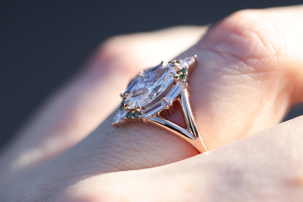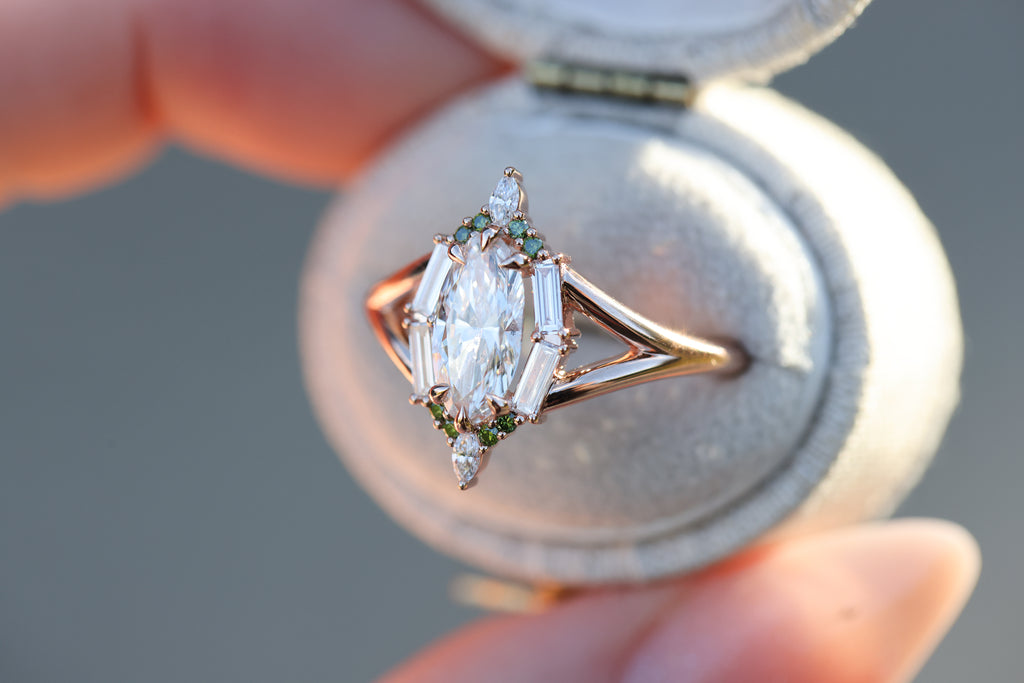 Sides/Accents: 3x1.5mm lab diamond, dark green diamonds