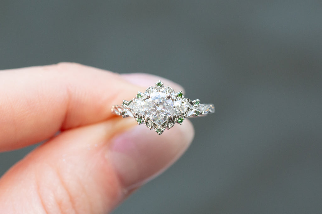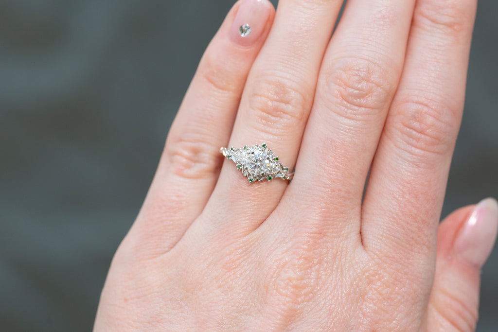 -Side/Accents Stones: 3mm trillion lab diamond, 1mm dark green irradiated diamond