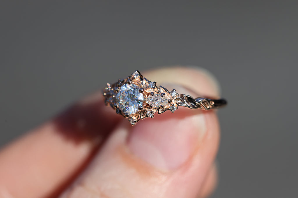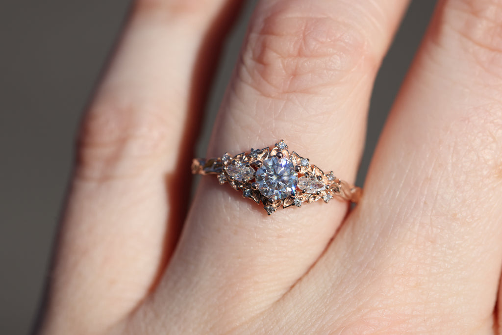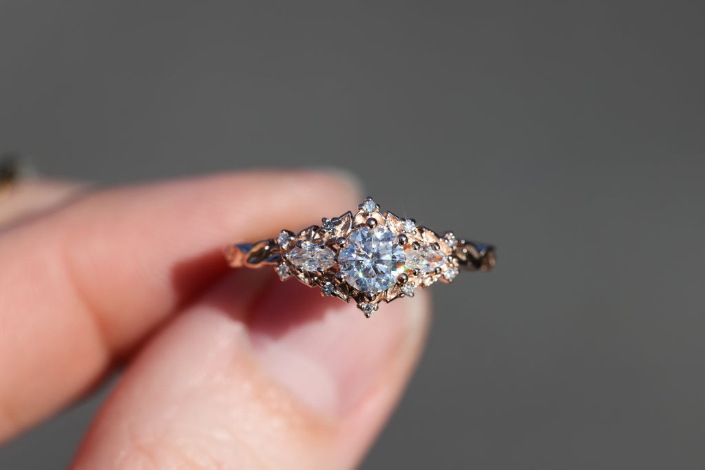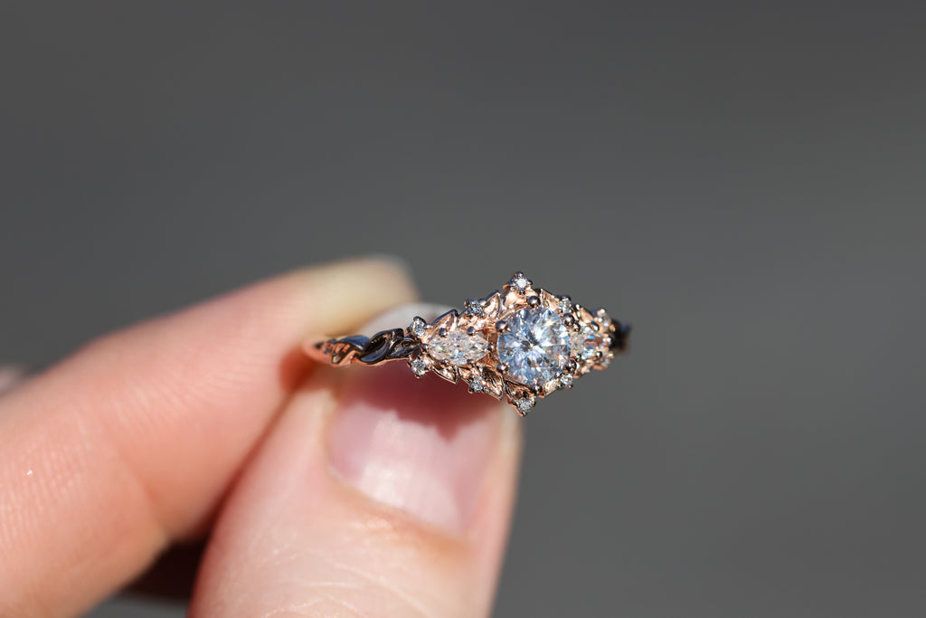 - Side/accents stones: 4x2mm marquise moissanite, 1mm round lab diamond