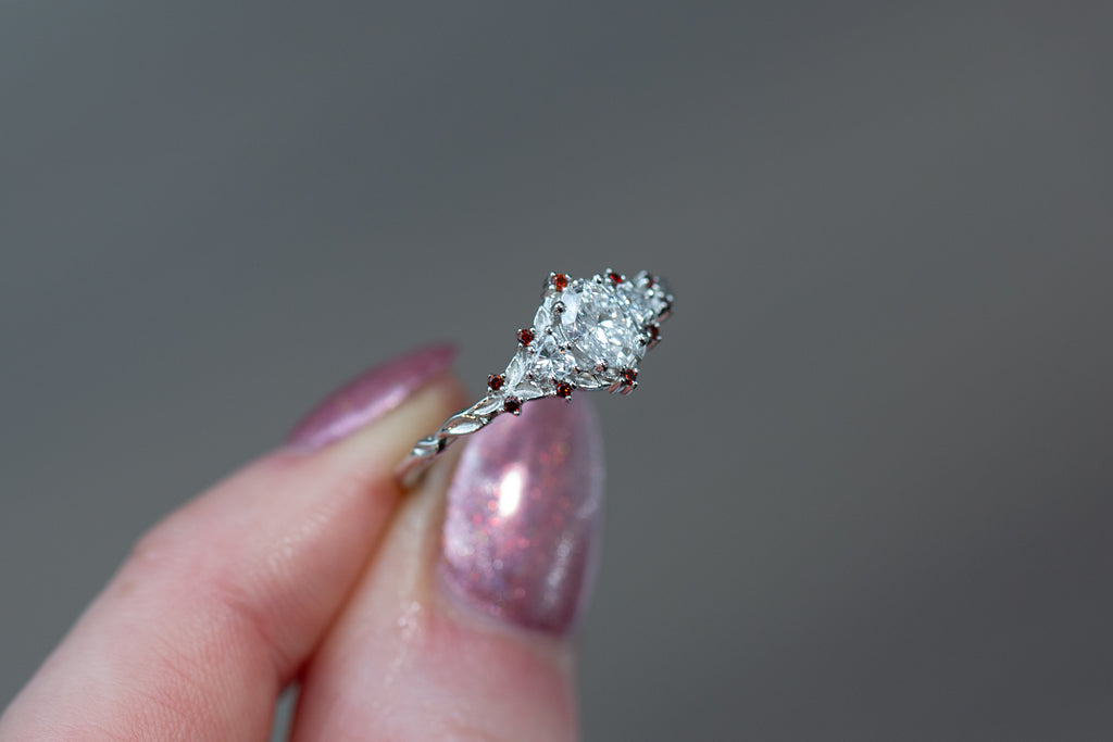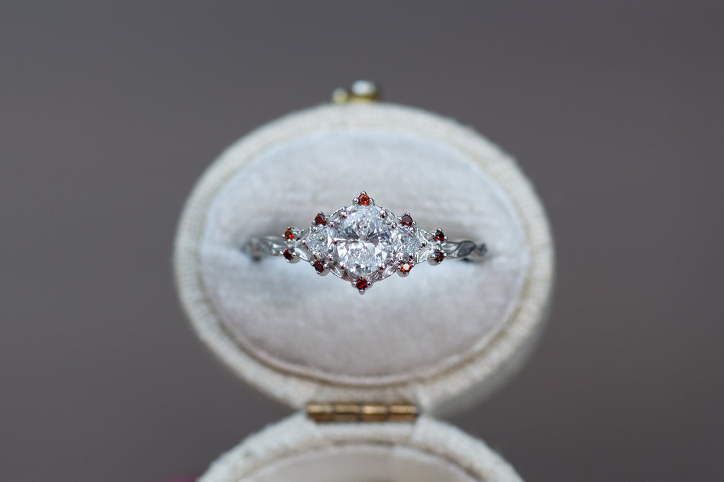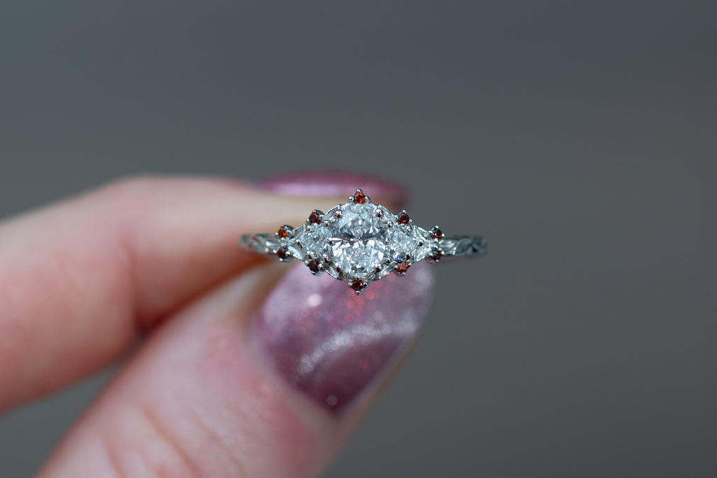 -Sides/Accents: 3mm trillion lab diamond, 1mm garnet