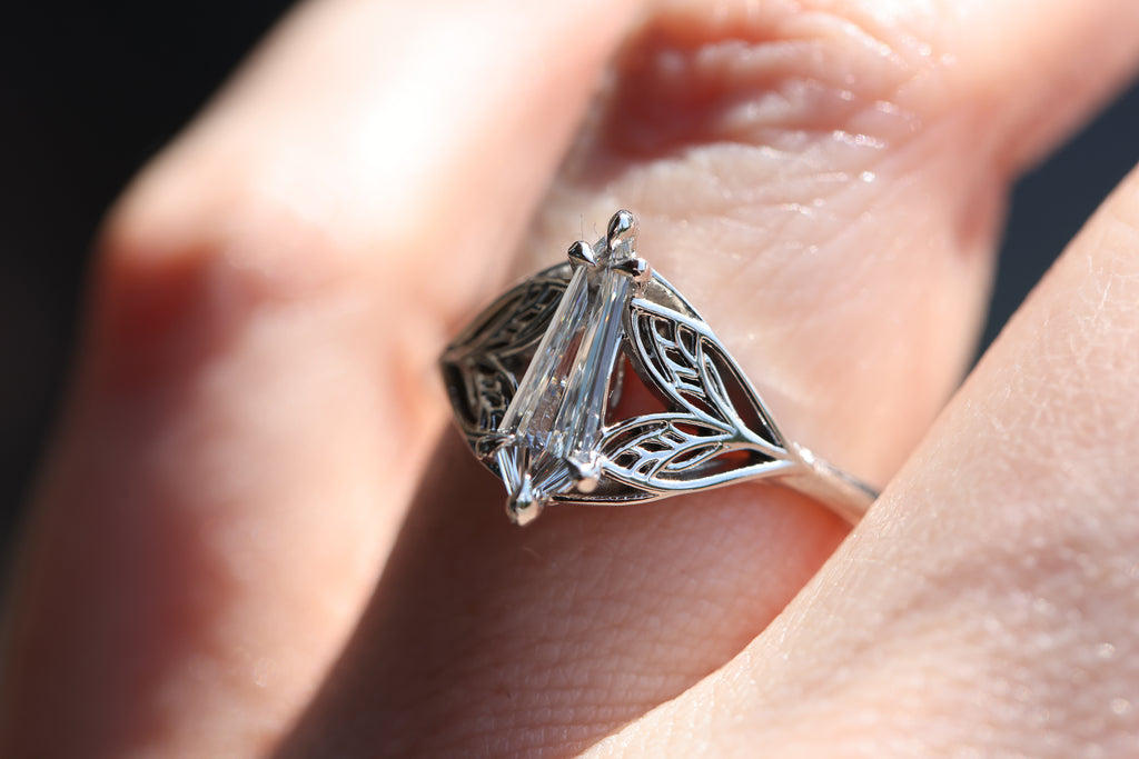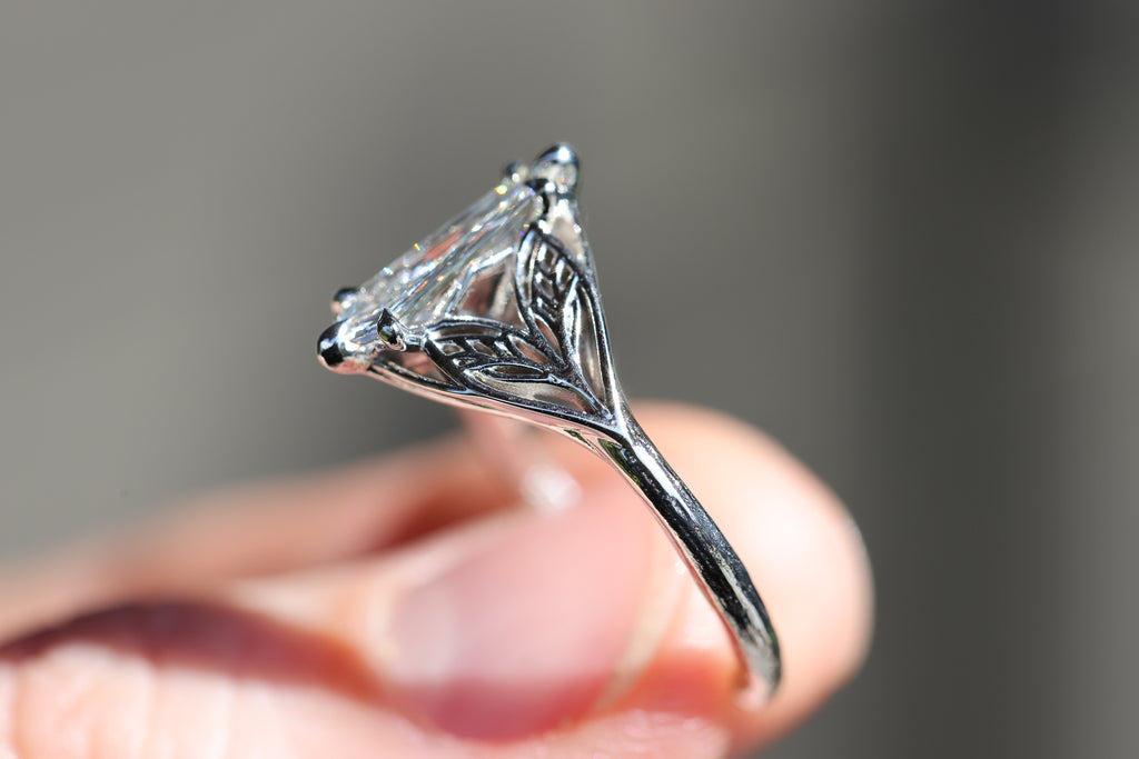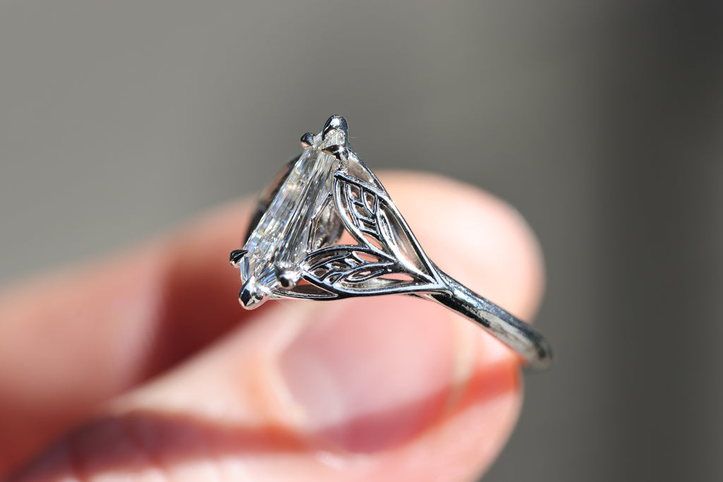 -Center stone: .58ct VS1 H-I color, natural kite/shield diamond. This stone is from misfit diamonds and does not come with certification.