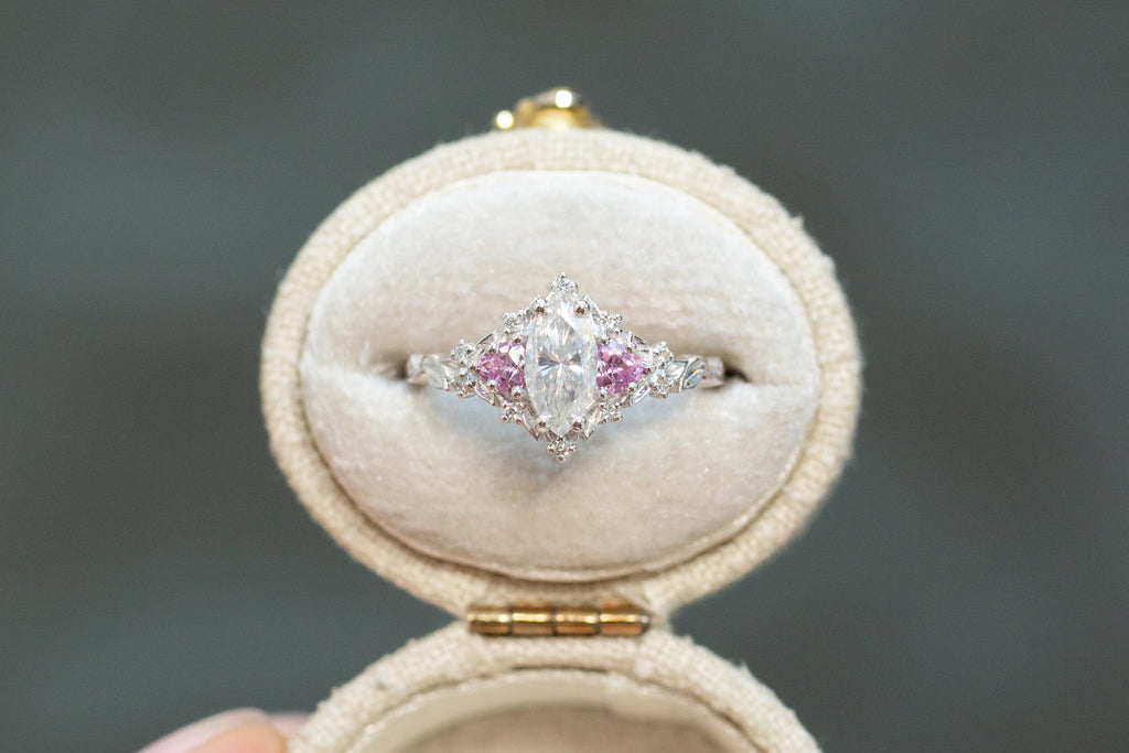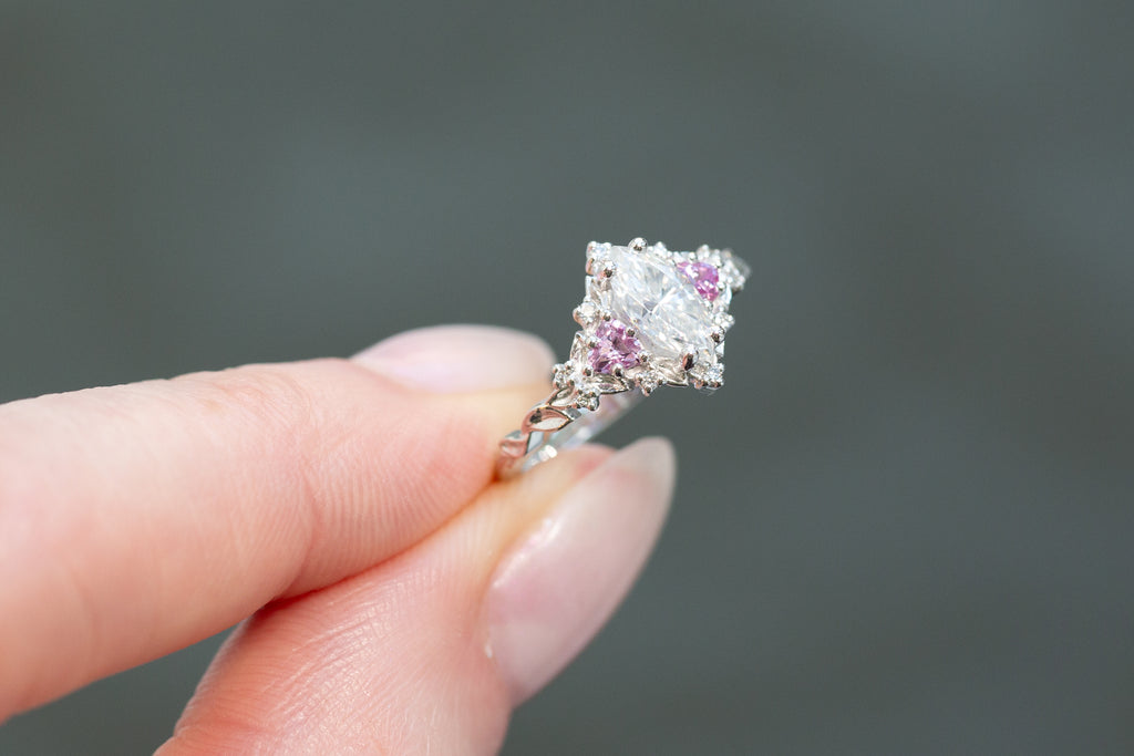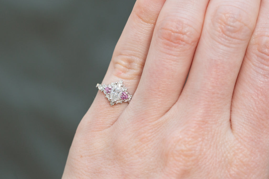 -Side/Accent Stones: 3mm trillion lab pink sapphire, 1mm round lab diamond