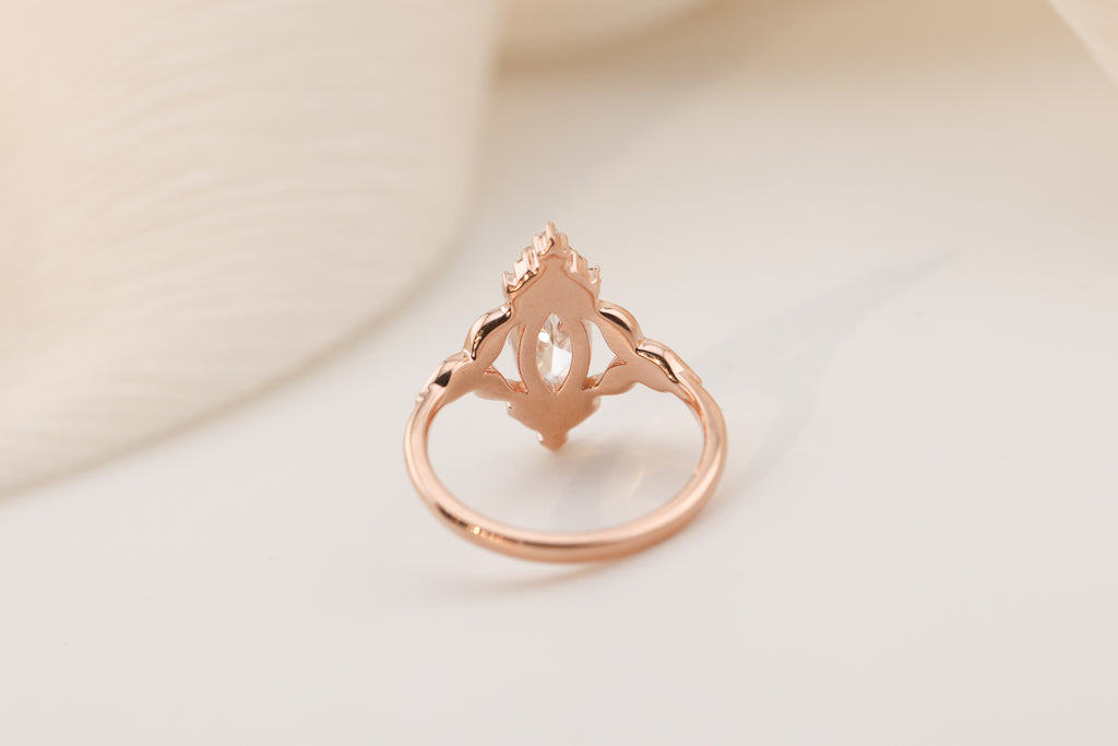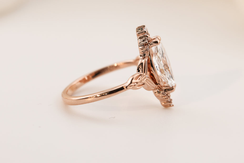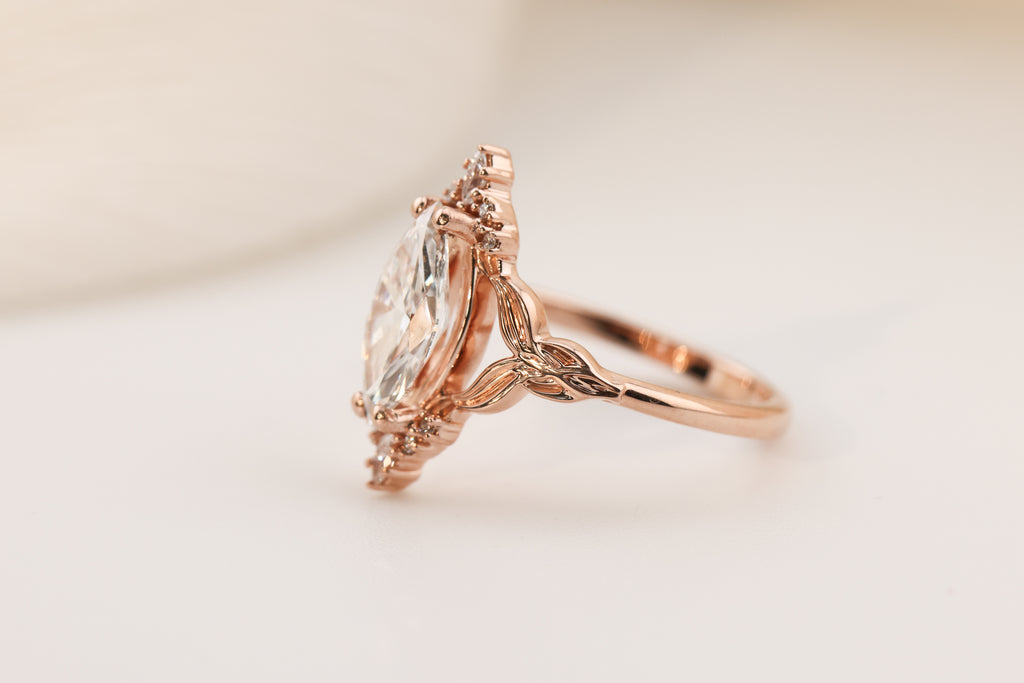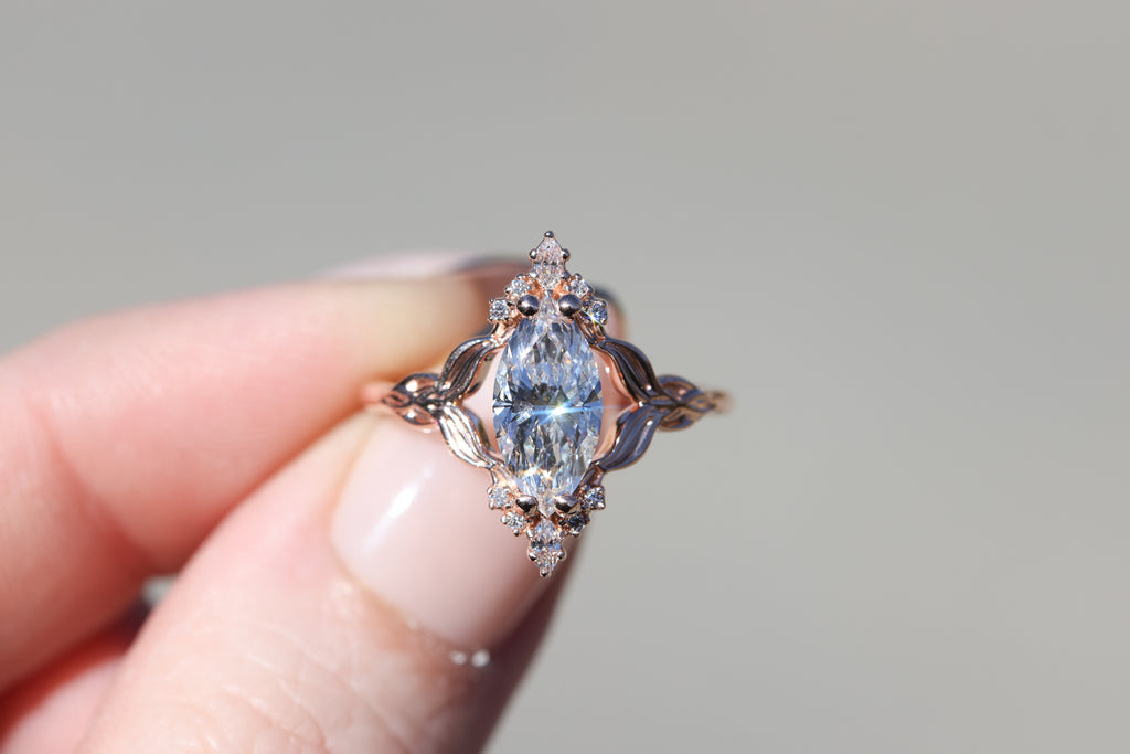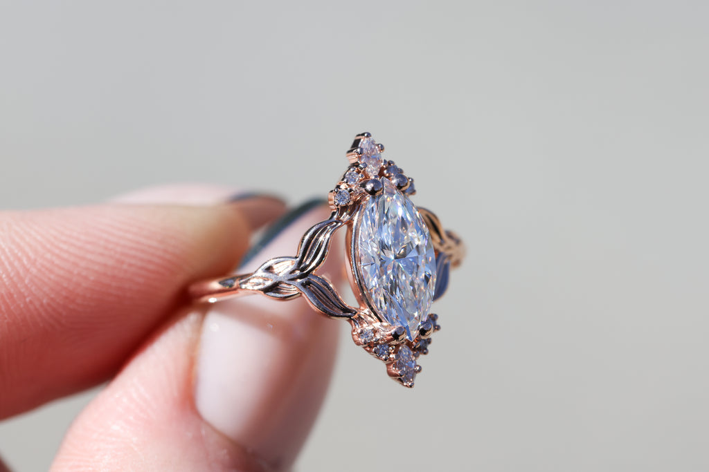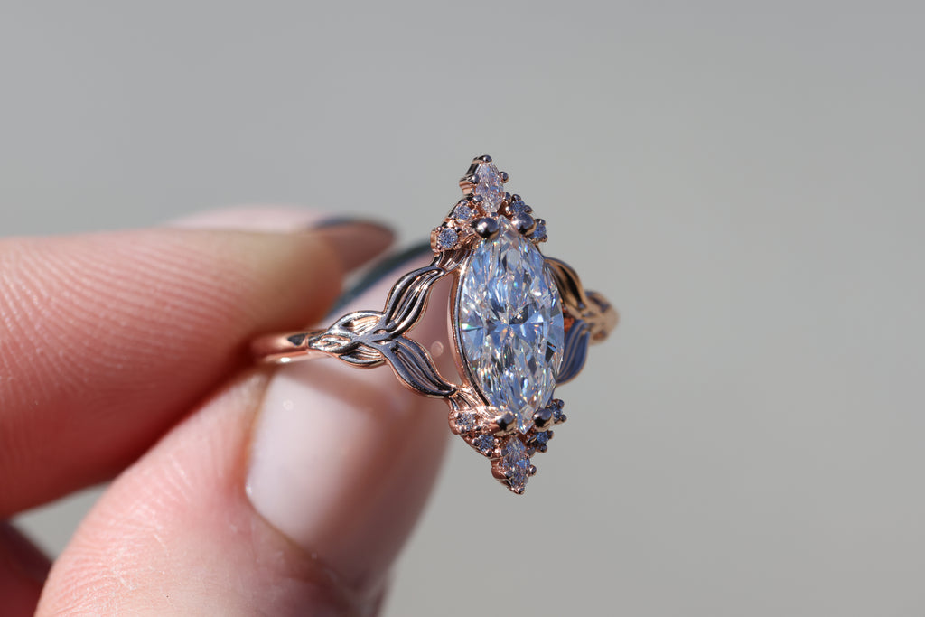 - 1.3ct marquise lab diamond center stone (I will select each diamond to be DEF and VVS2 or better, around 12x6mm)