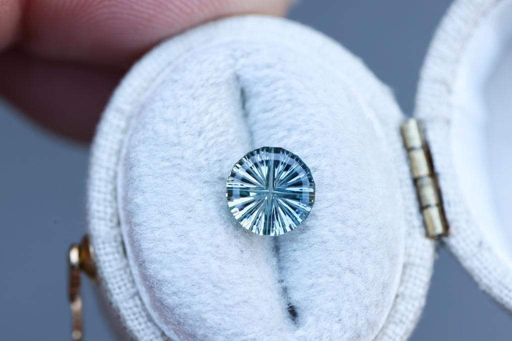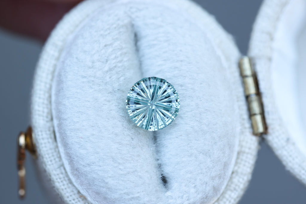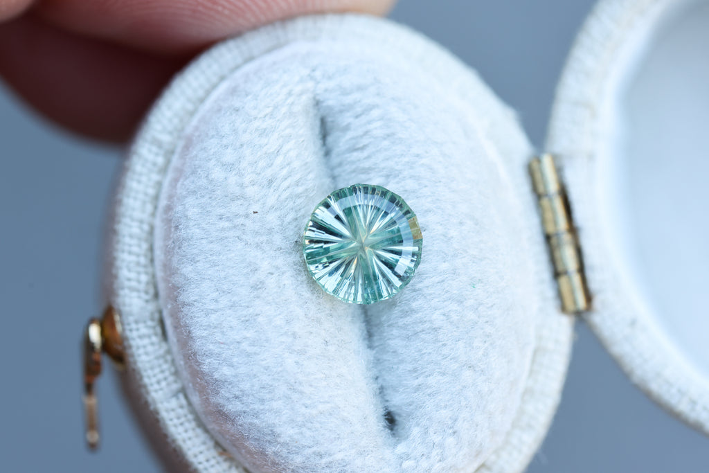 1.37ct round light blue green sapphire, Starbrite cut by John Dyer