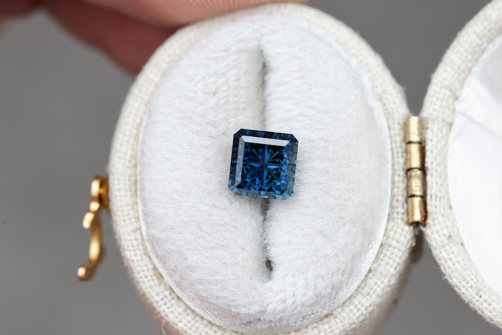 1.69ct square dark blue teal sapphire, Starbrite cut by John Dyer