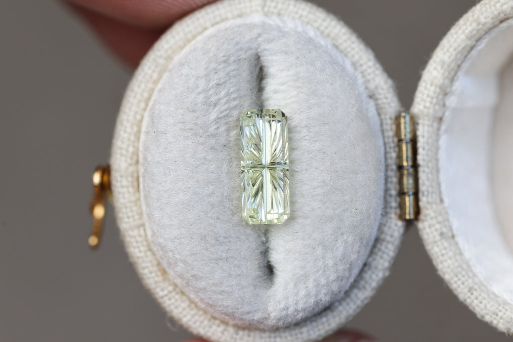 1.98ct rectangle pale yellow green sapphire, Starbrite cut by John Dyer