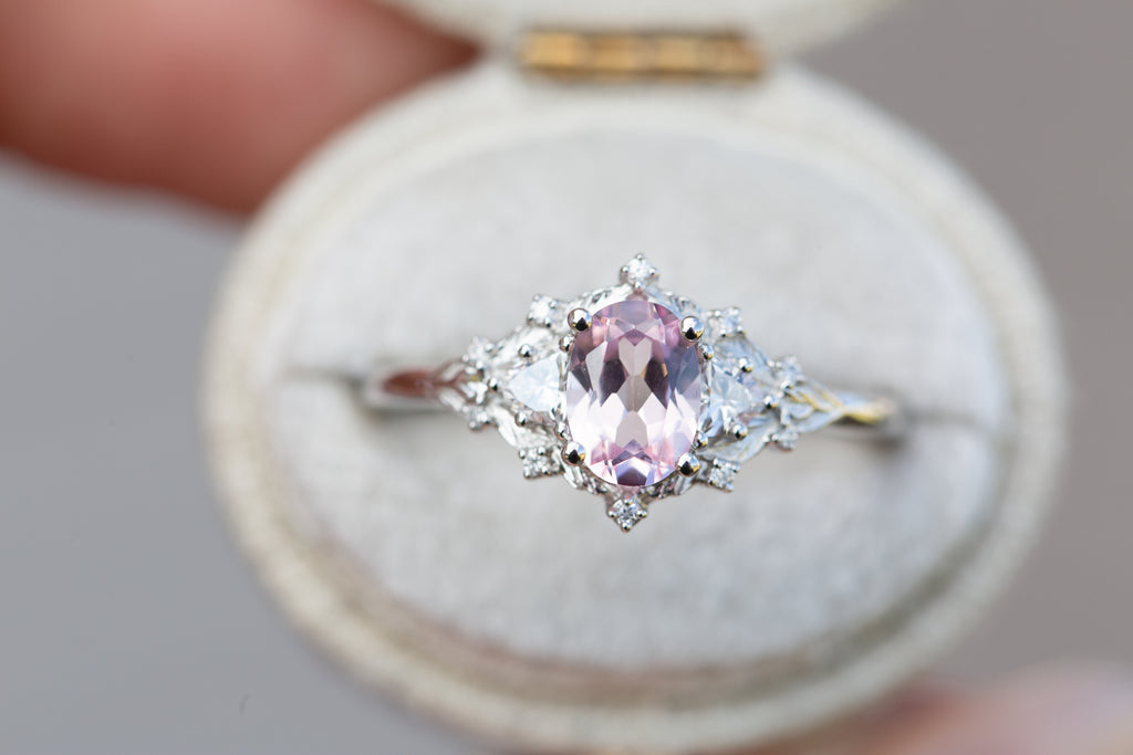 Briar rose three stone with grade A natural pink sapphire oval center