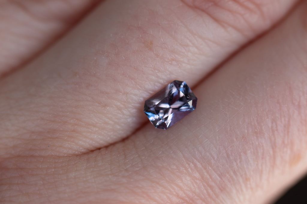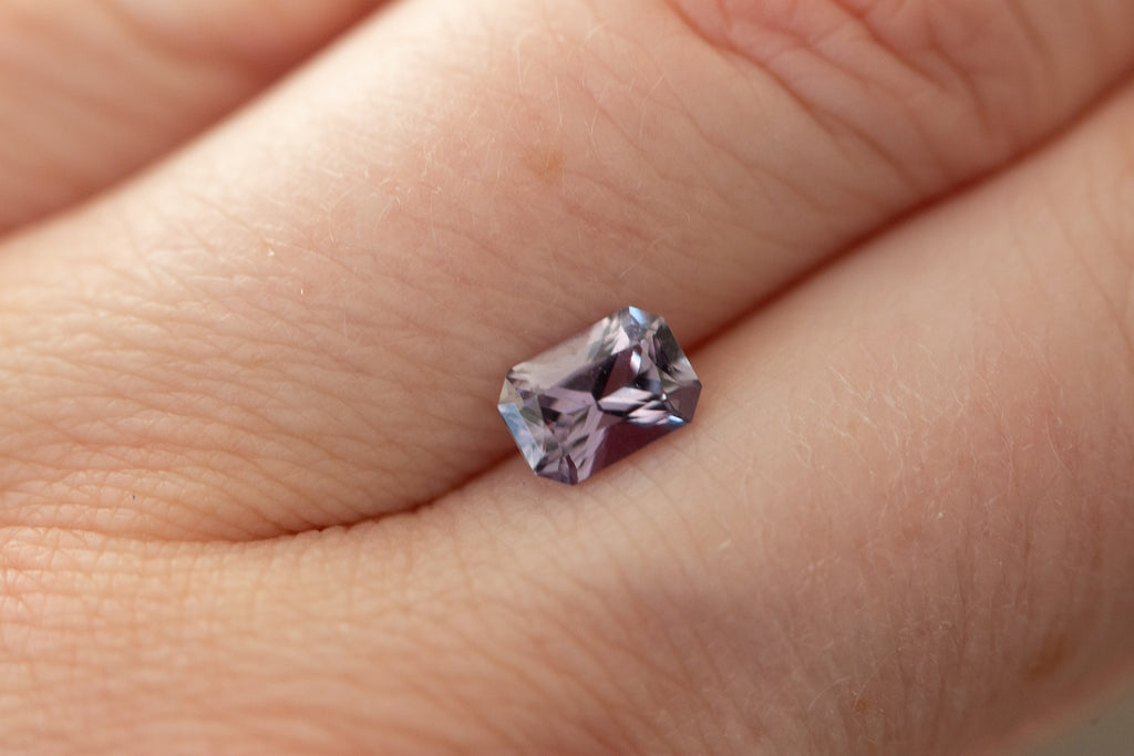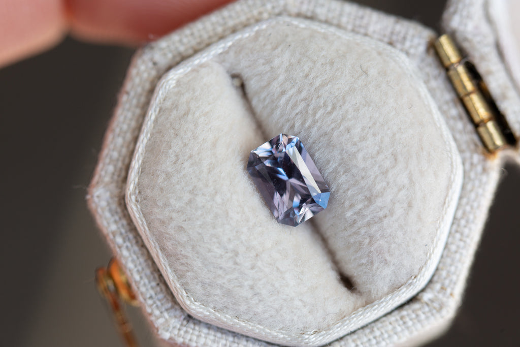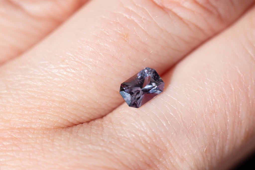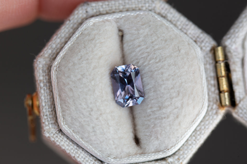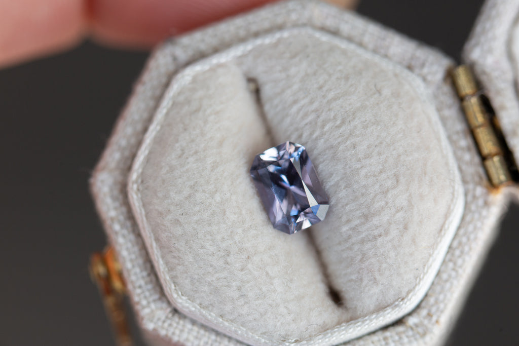 This stunning emerald cut sapphire is a mauve lavender that shifts color in different lighting - sometimes it appears more grey purple and other times more mauve purple. It is such a gorgeous stone!