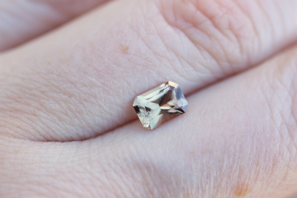 This absolutely stunning emerald cut sapphire has such special coloring! It is an orange color that shifts depending on the lighting and sometimes has a little khaki green to it! So beautiful!