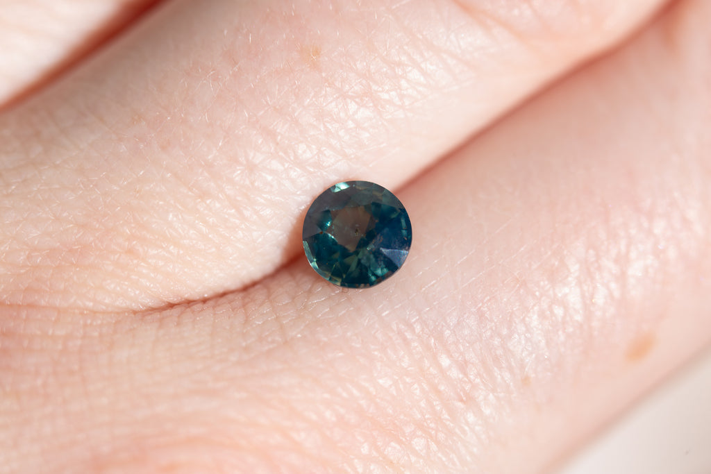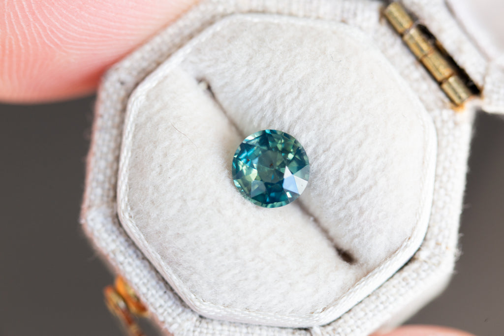 A beautiful round teal sapphire! This lovely stone has the prettiest coloring that pulls more of a green teal or blue teal depending on the lighting!