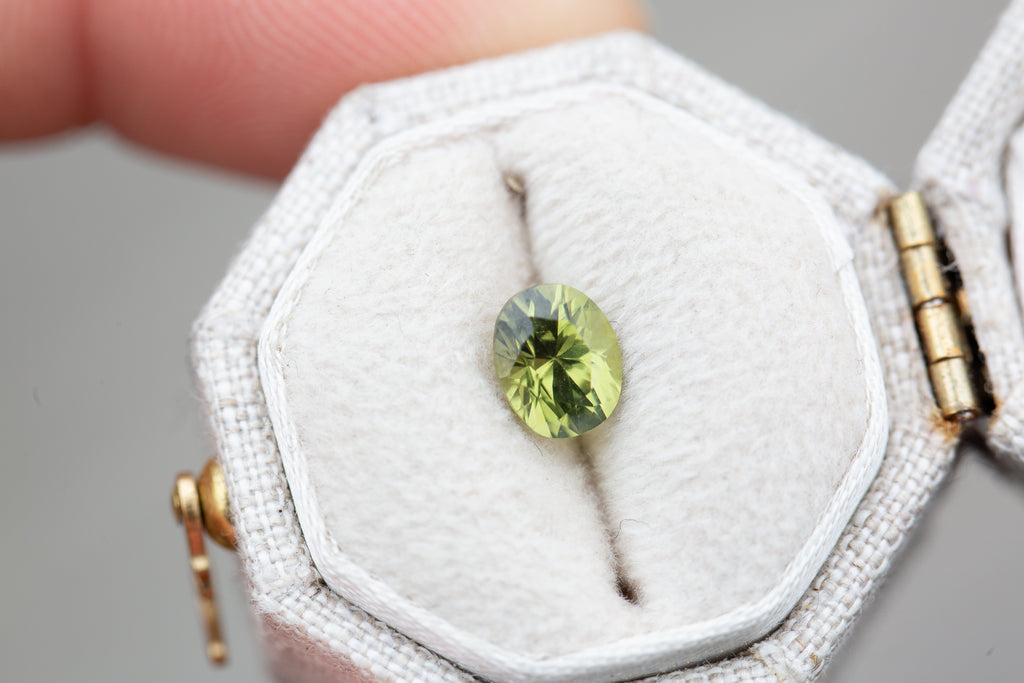 This gorgeous medium green sapphire has such beautiful faceting for incredible sparkle!
