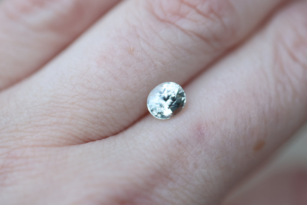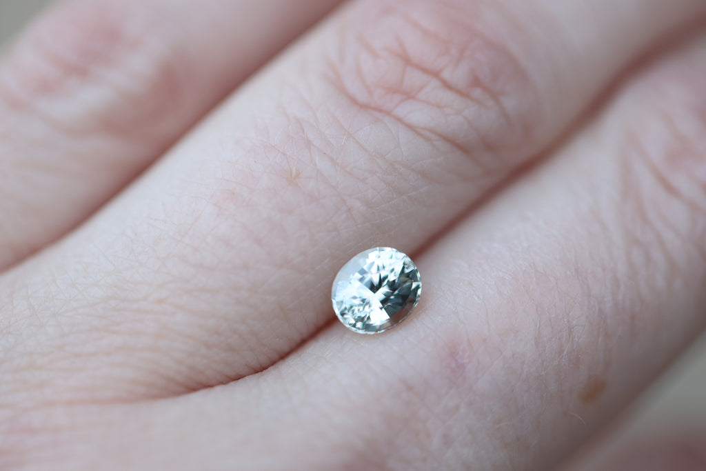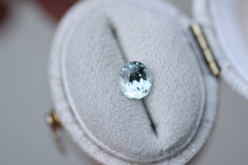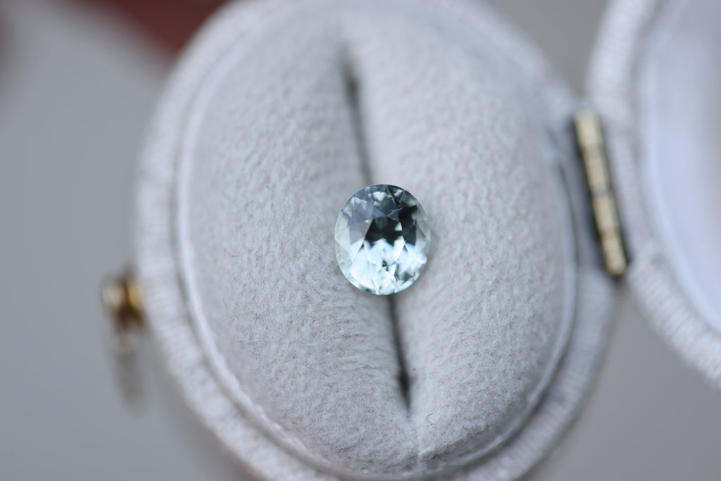 This icy beauty is an oval sapphire with very pale mint coloring that is almost white!