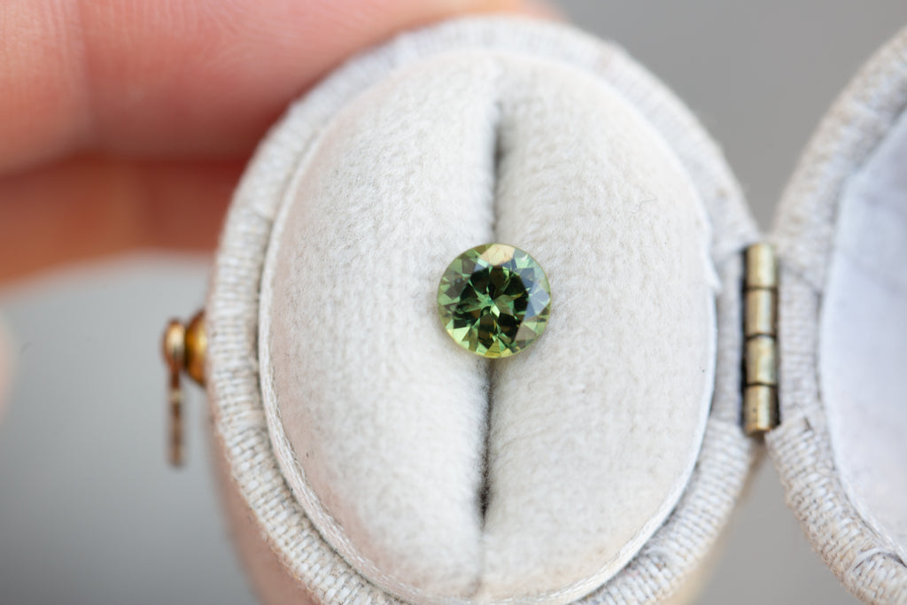 This gorgeous round sapphire is like garden sunshine with its bright green yellow coloring and incredible sparkle! Such a special stone!