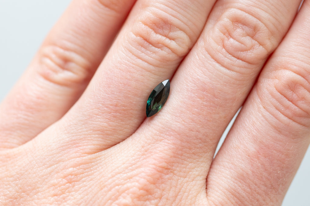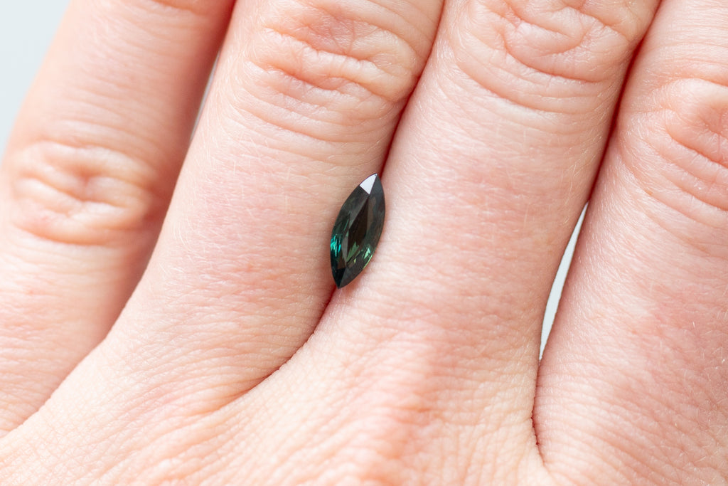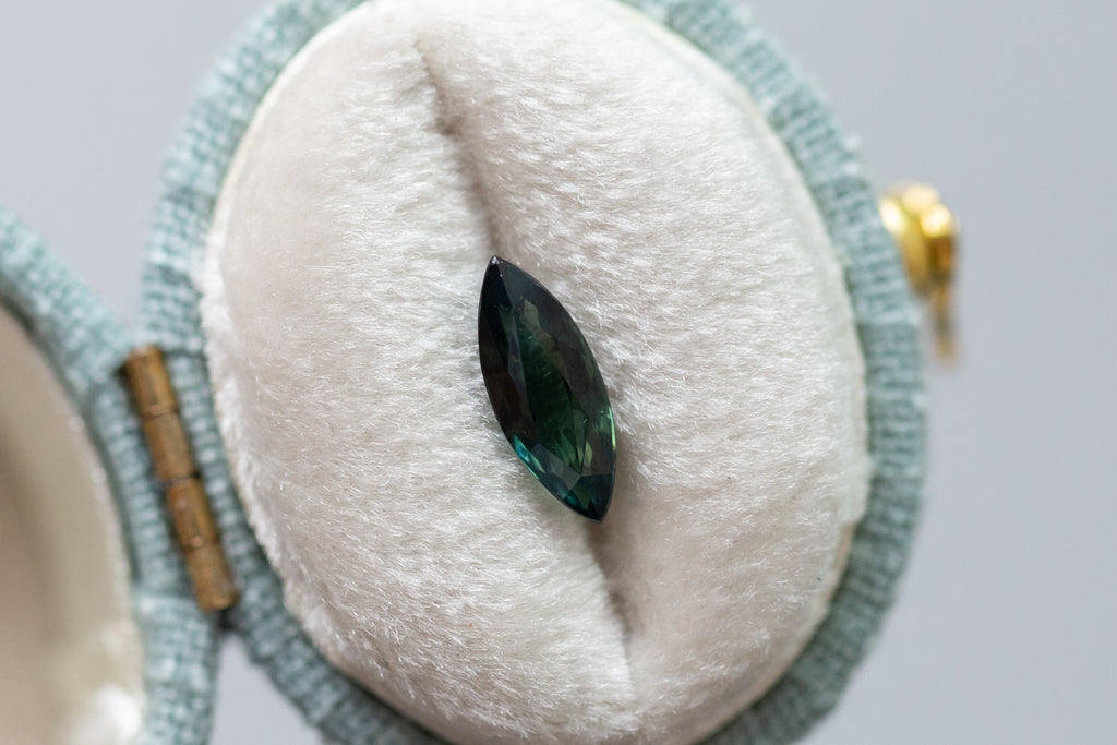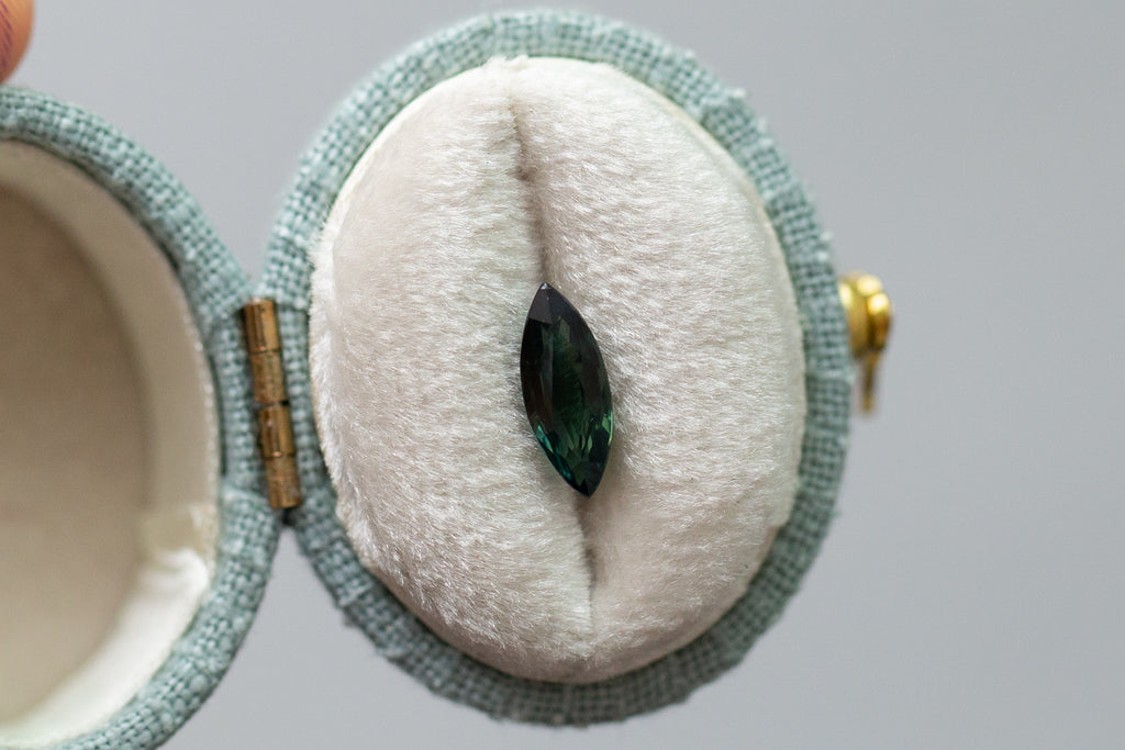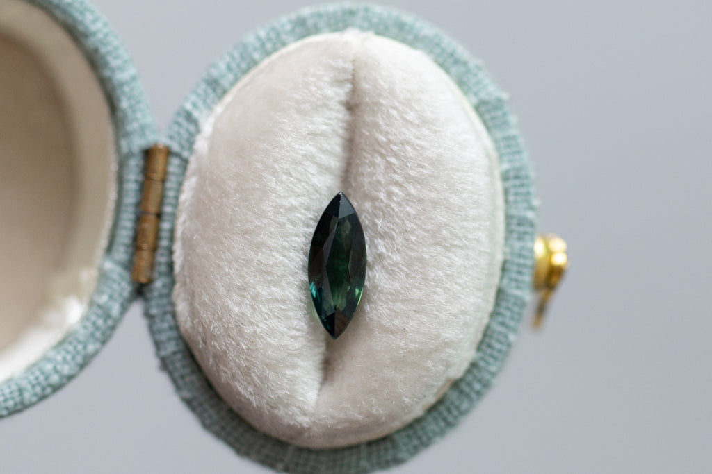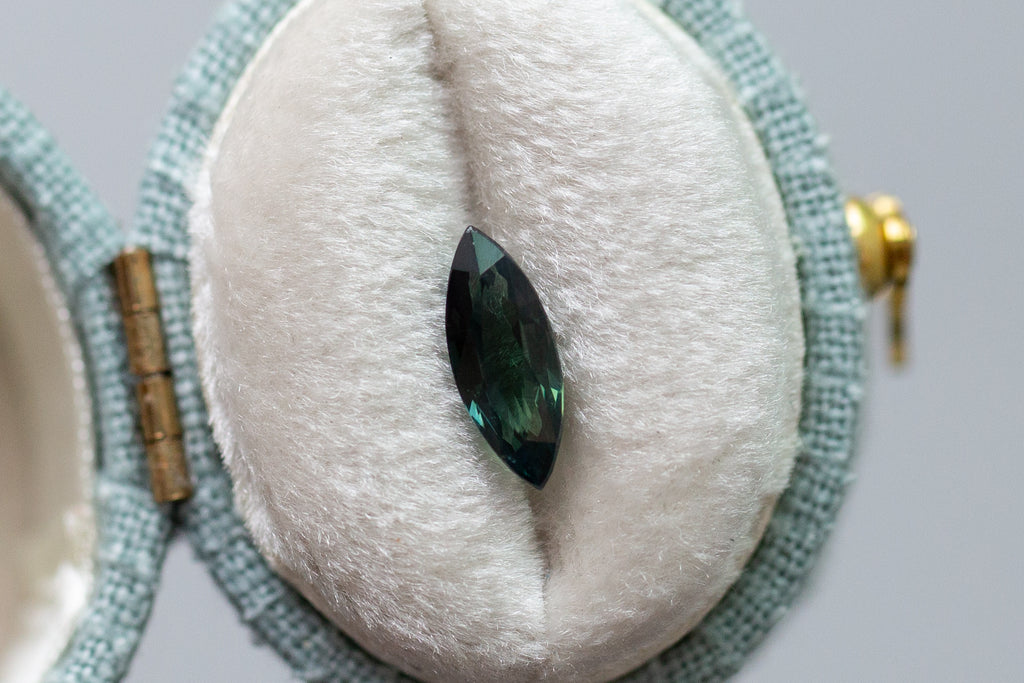 A gorgeous dark green marquise sapphire that looks more teal green in some light!