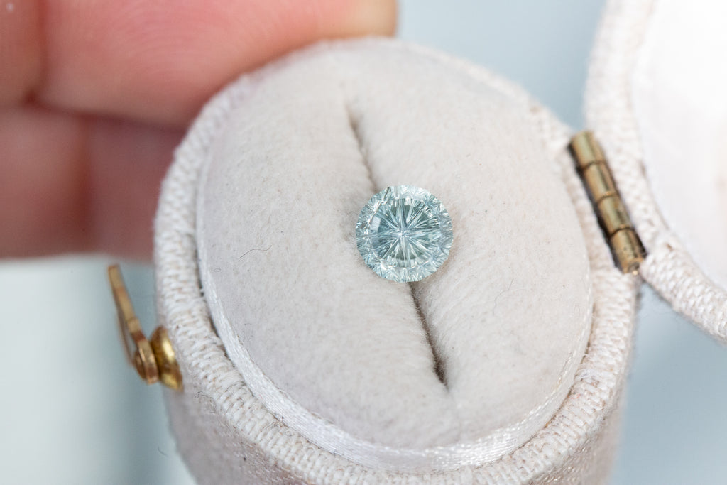 This absolutely incredible beauty is an icy light teal round sapphire with the most amazing Starbrite cut by award winning gem cutter John Dyer. It is just such a gorgeous stone!