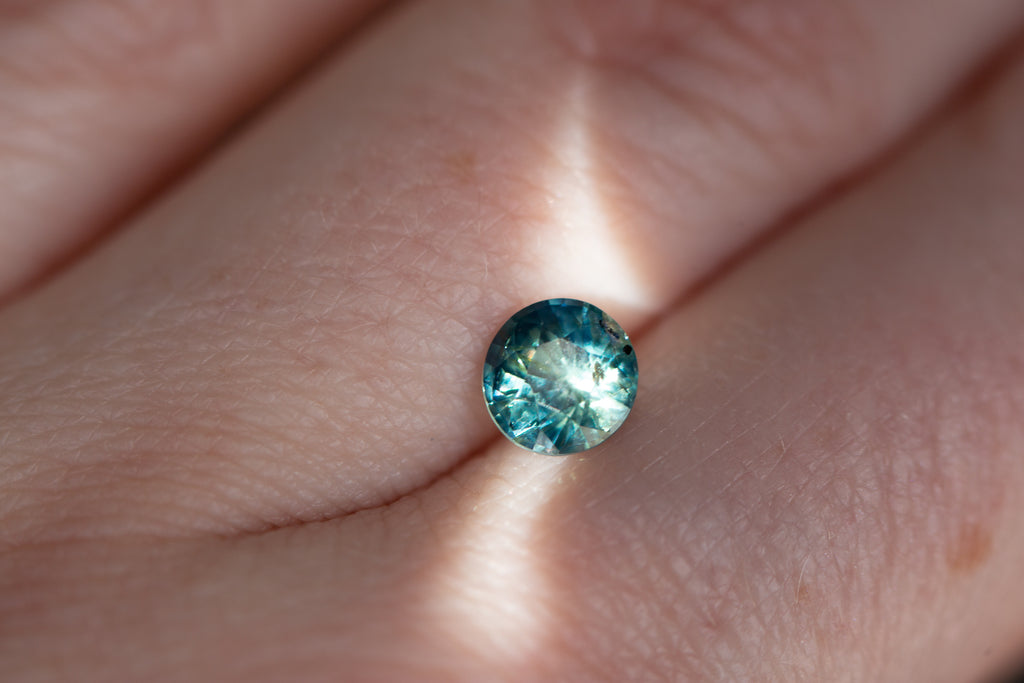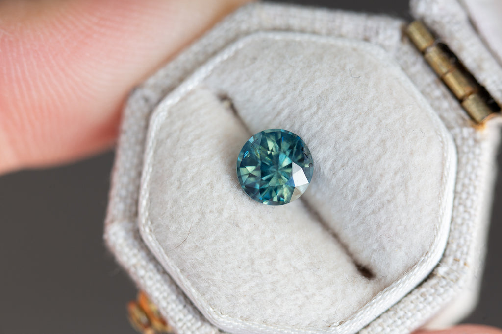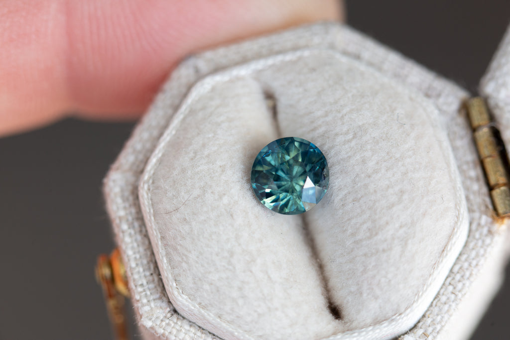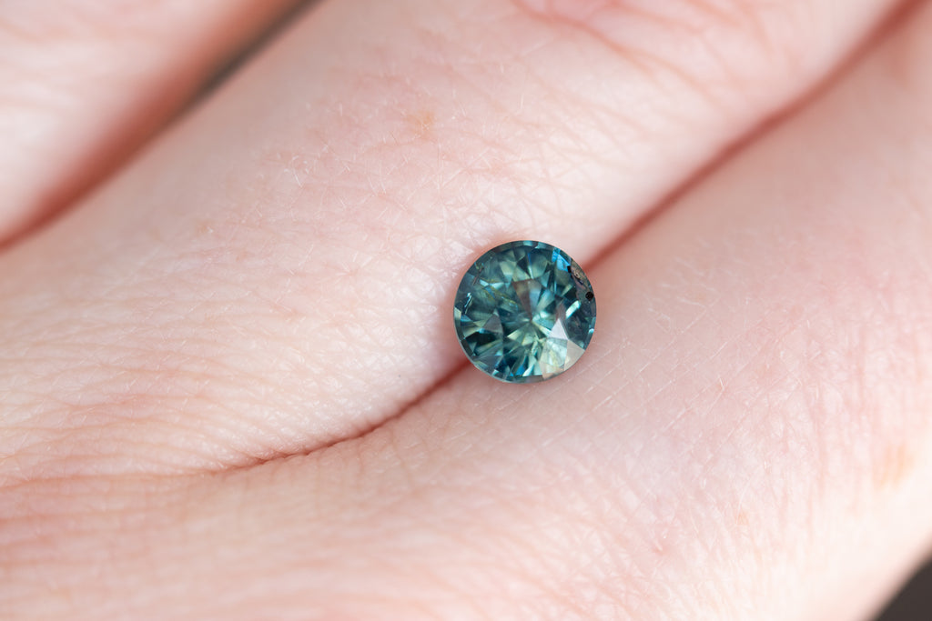 This stunning round teal sapphire has such beautiful faceting that give the stone lots of sparkle and color dimension!