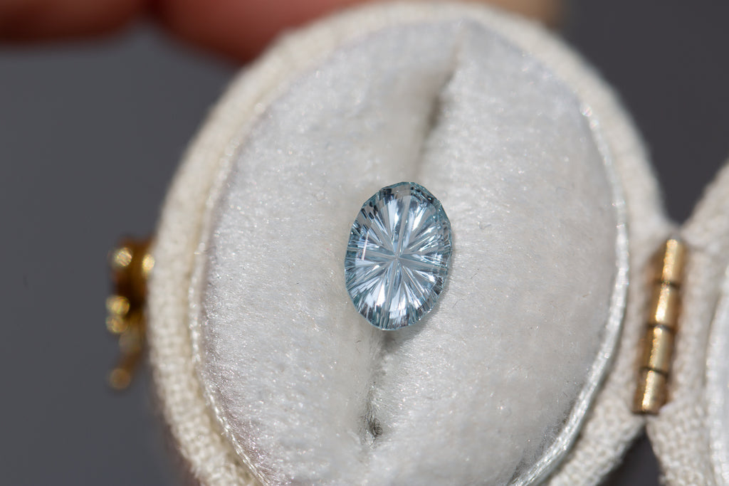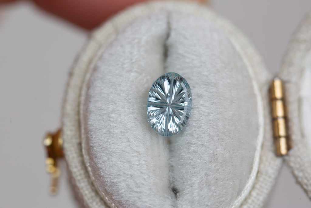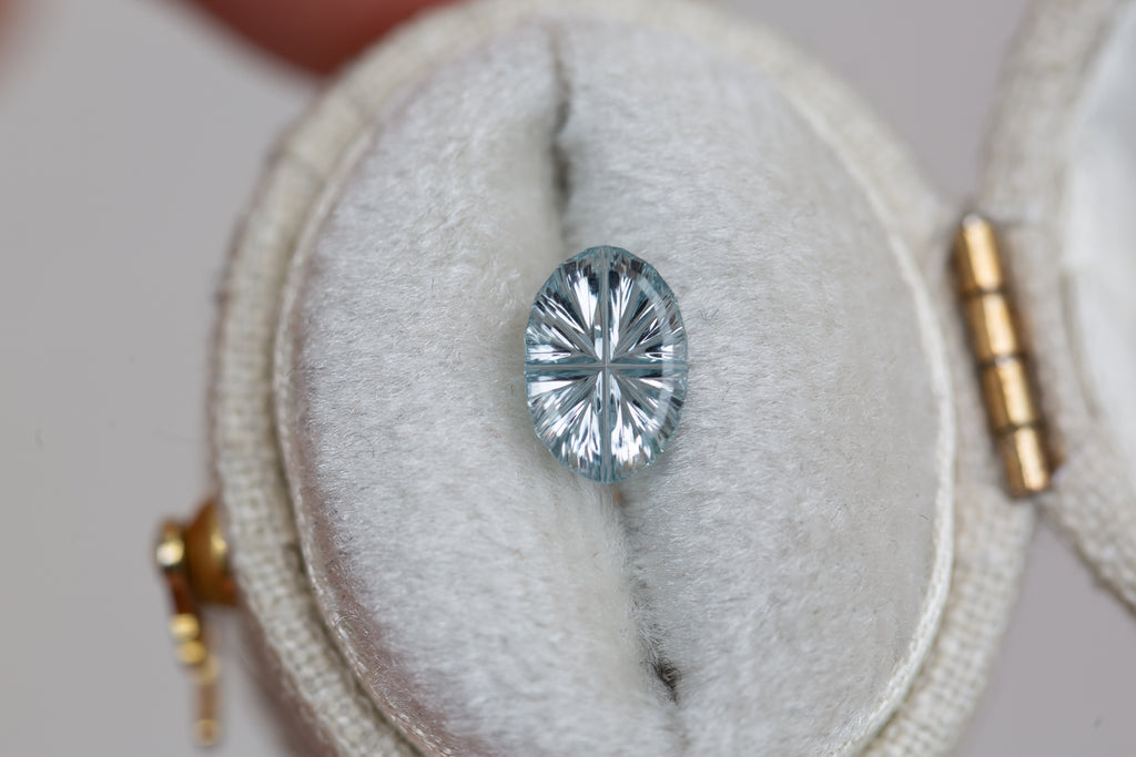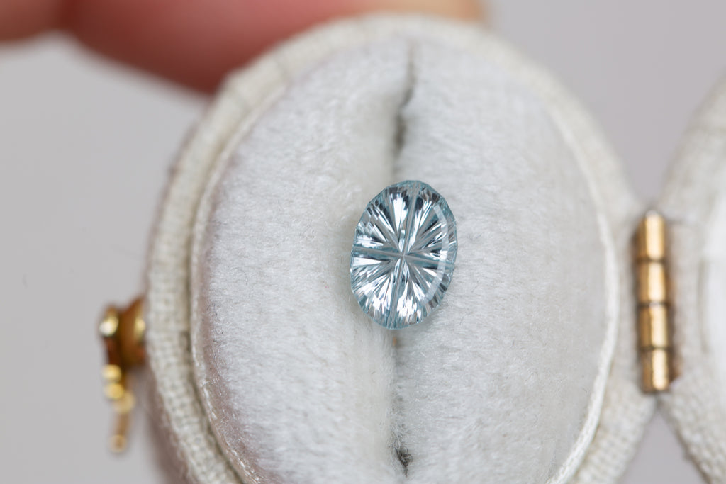 Very pale blue almost white oval Starbrite sapphire, custom cut by award winning cutter John Dyer.