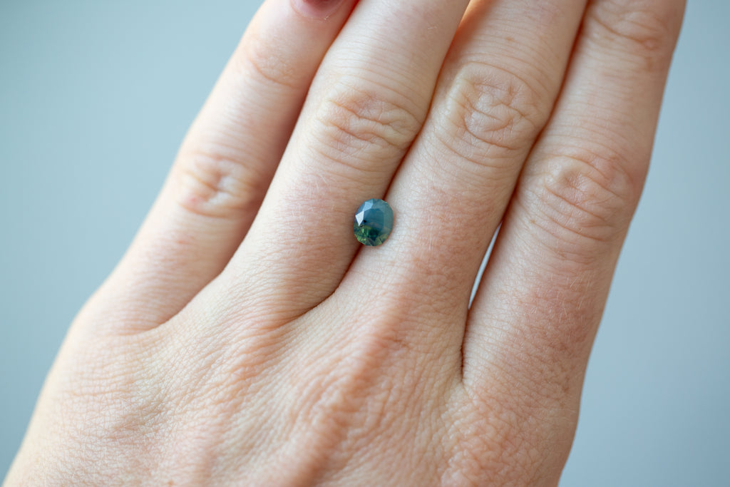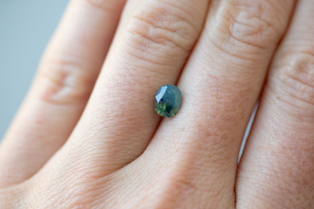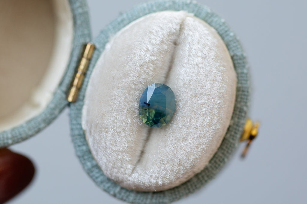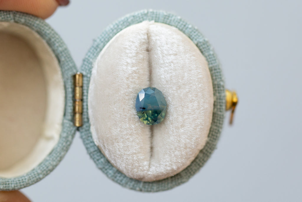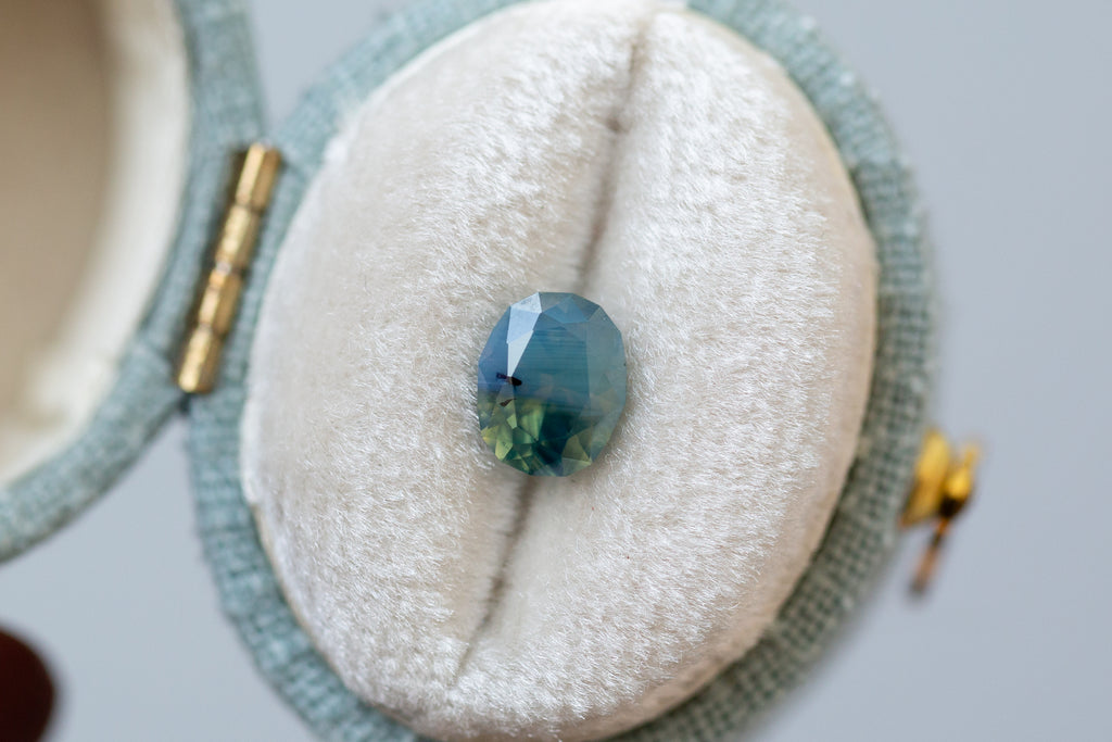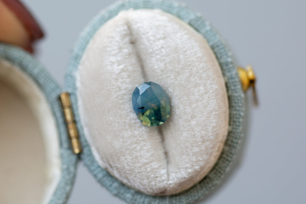 This stone is so unique featuring opalescent blues, sparkling greens, and a couple striking inclusions! Gorgeous!