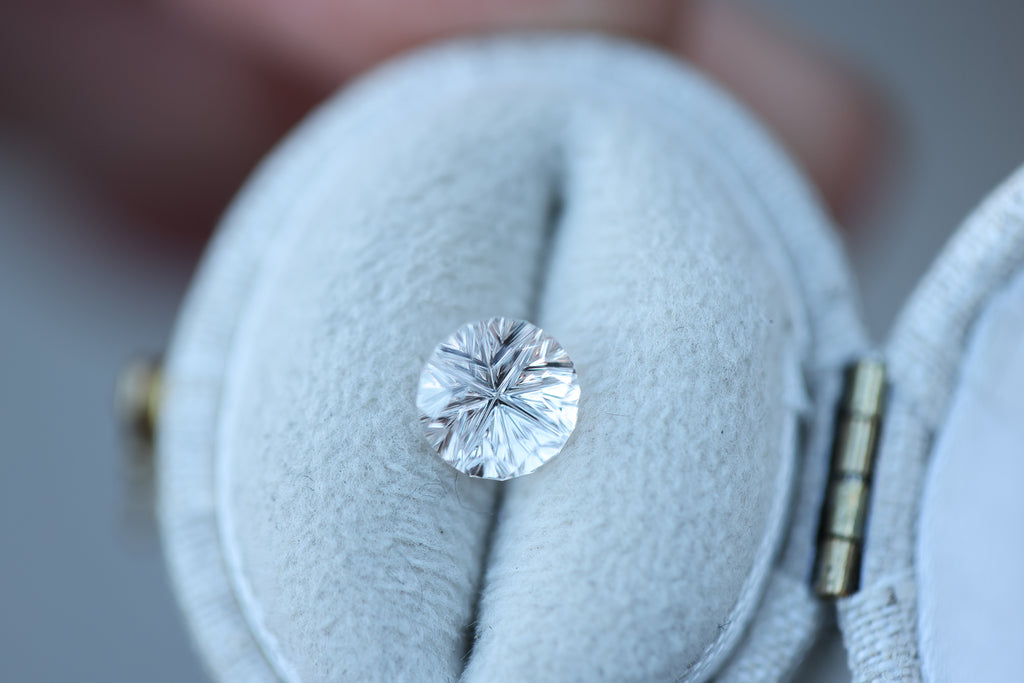 This absolutely gorgeous round Starbrite cut sapphire is from award winning gem cutter John Dyer! It is a very light pink that can look white depending on the lighting! Just the most incredibly special stone!
