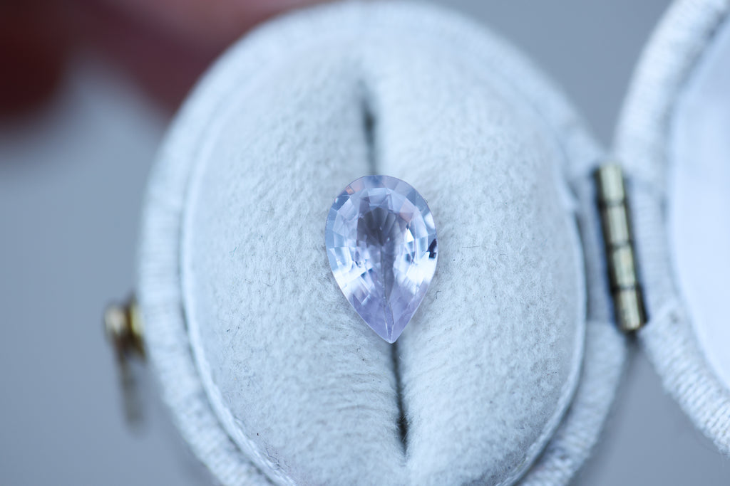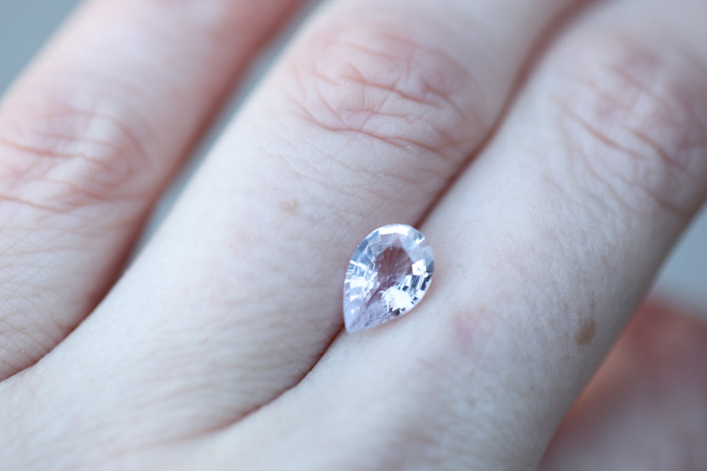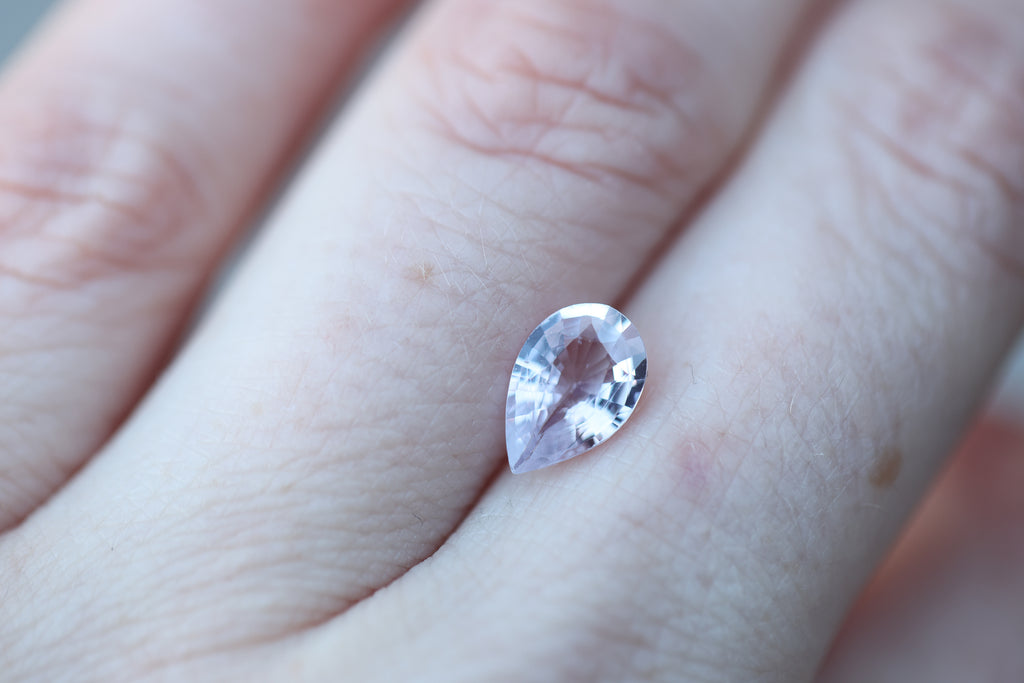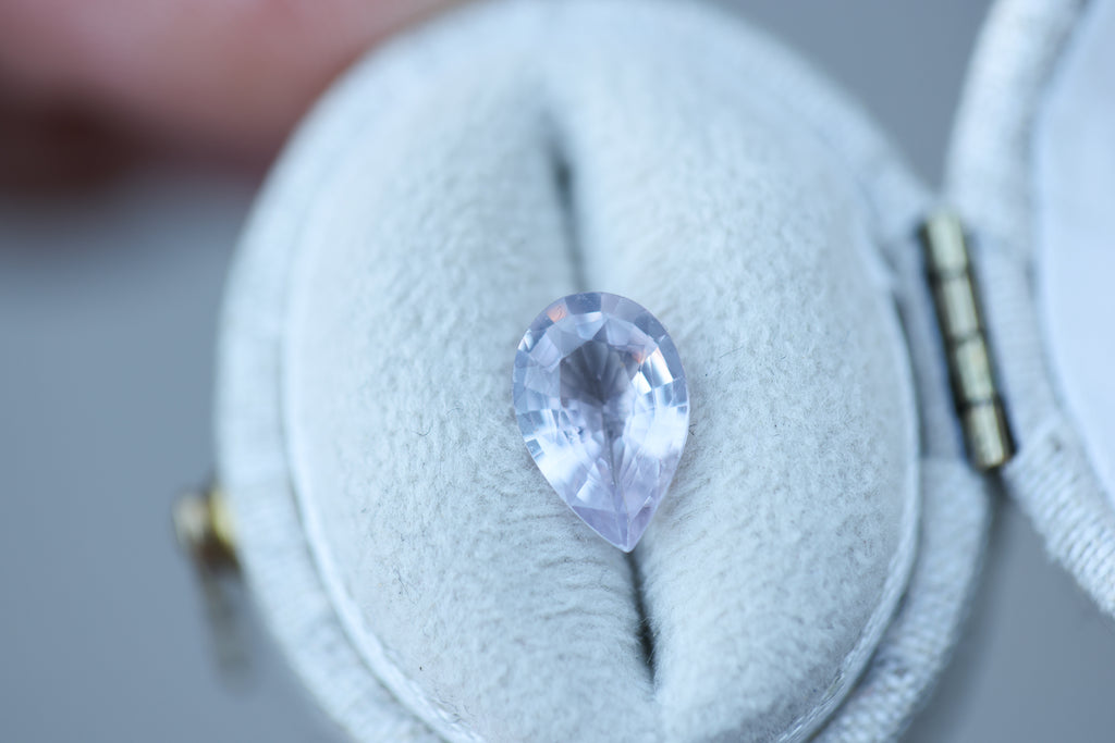 This gorgeous pear light pink sapphire has a bit of a lavender undertone which shows more in photos than in person! It has the loveliest coloring and in certain outdoor lighting has shimmer of opalescence to it!