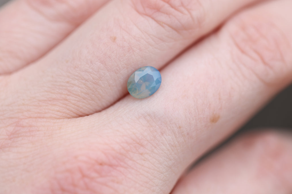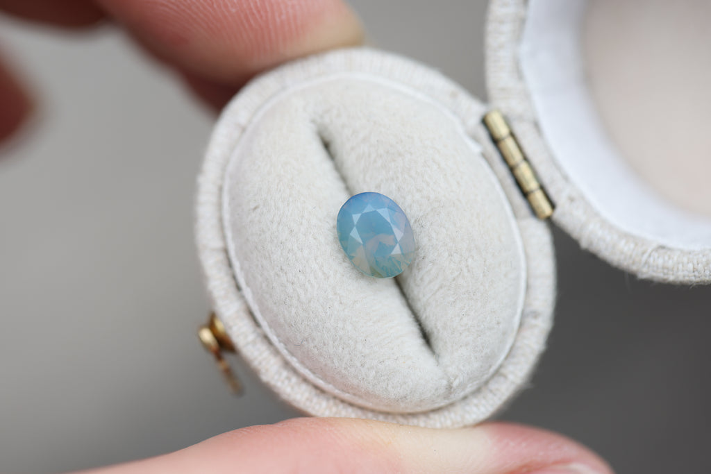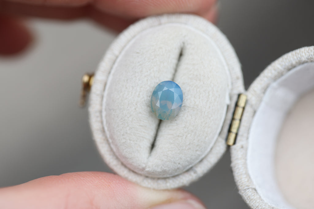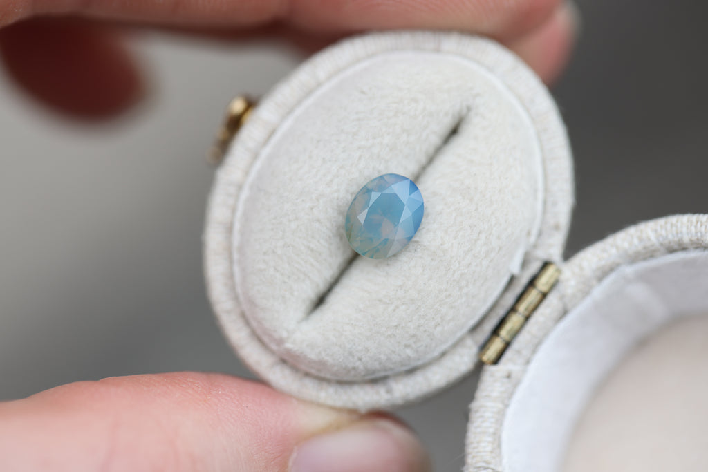 This absolutely gorgeous oval sapphire is such a unique opaque light blue that's a little ethereal and a little moody with its added murkiness! It's such a special beauty!