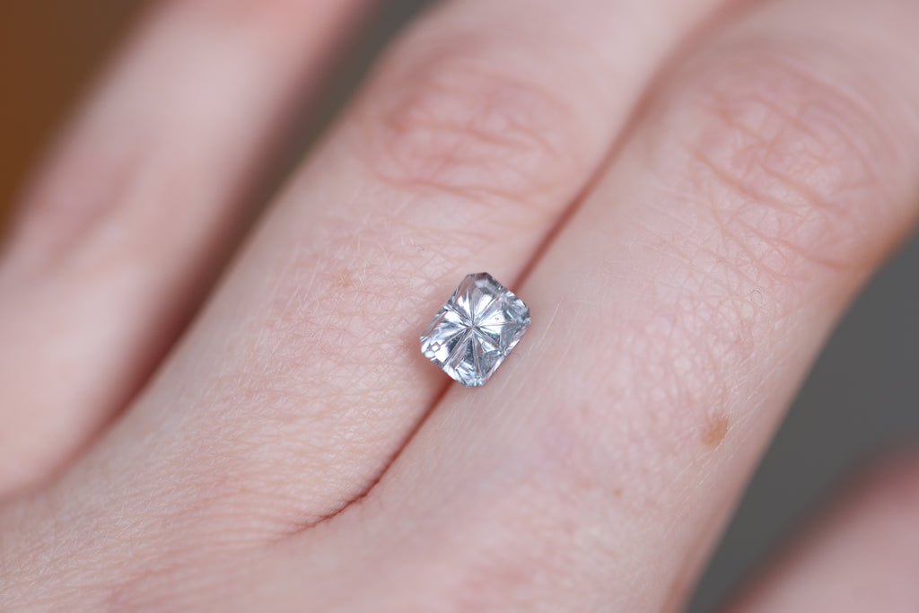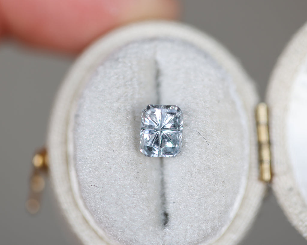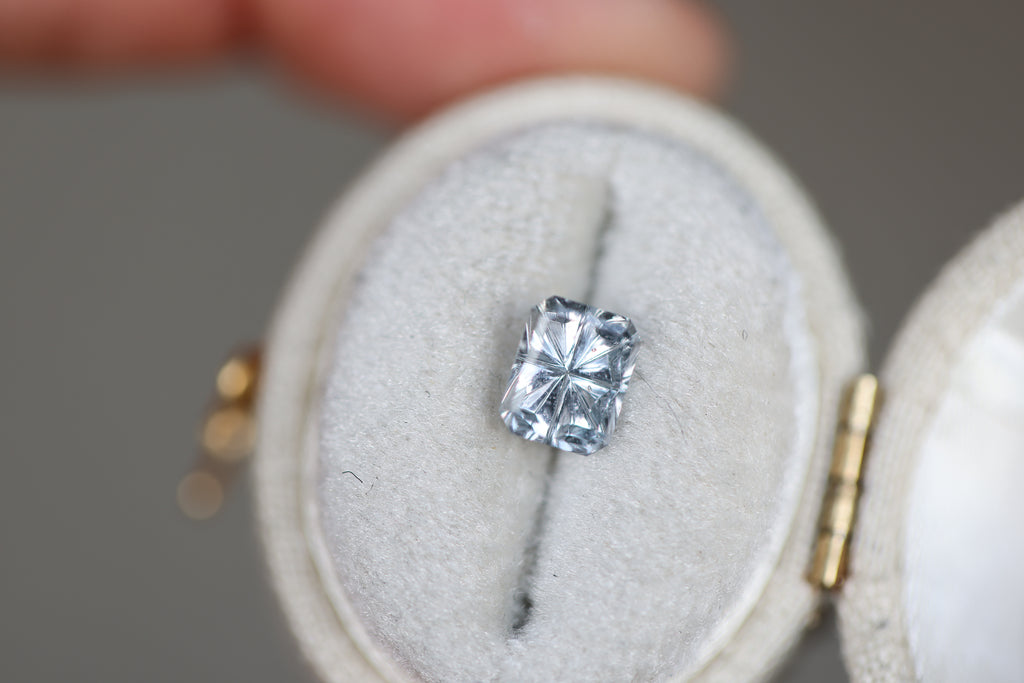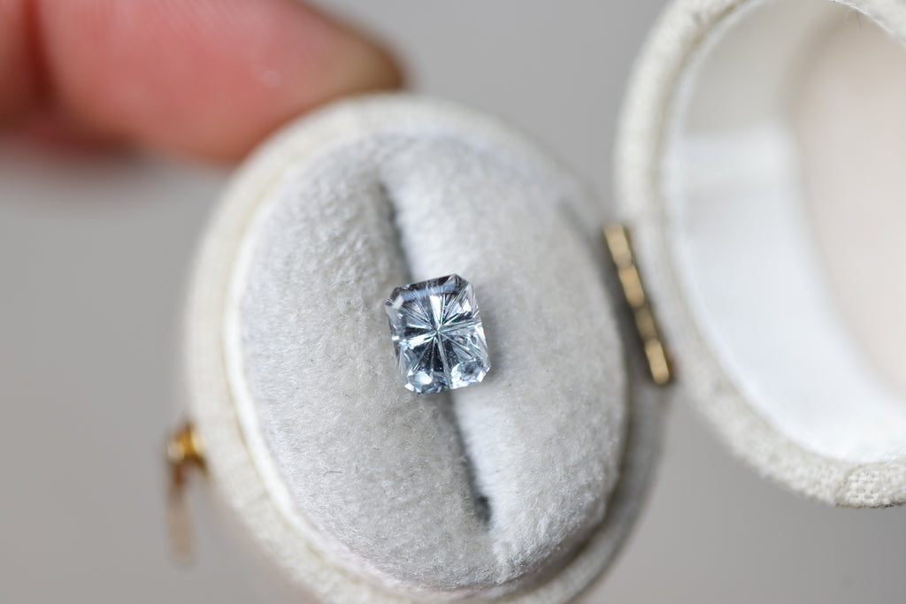 This icy silver sapphire can sort of take on a slight bit of light purple in some lighting! Such a special stone featuring Starbrite Cut faceting by John Dyer!