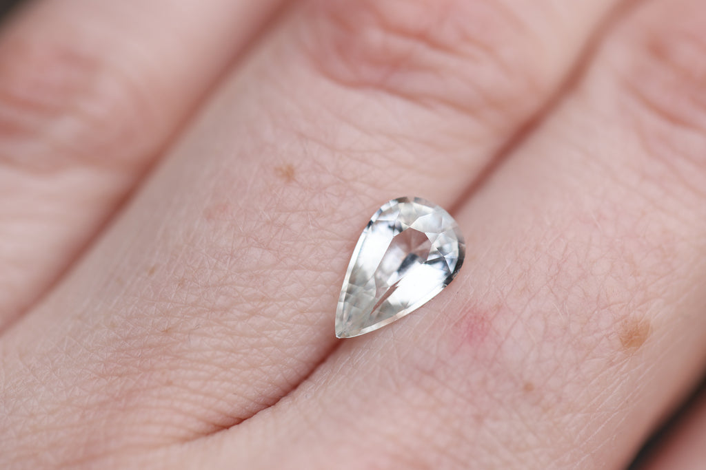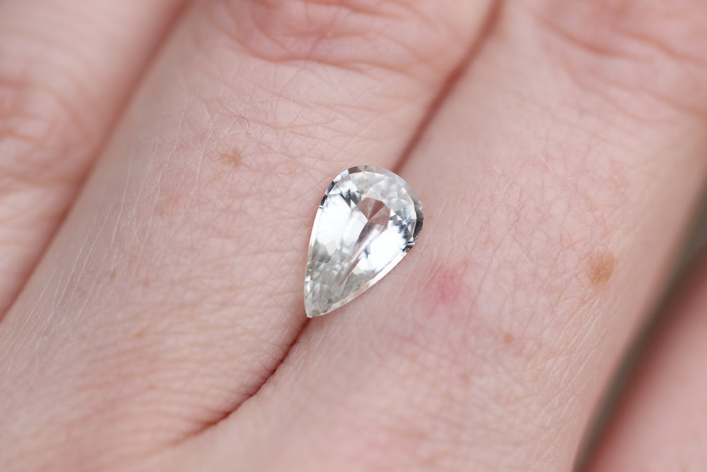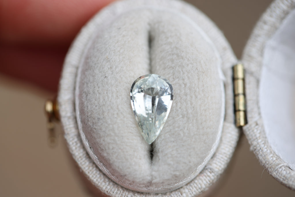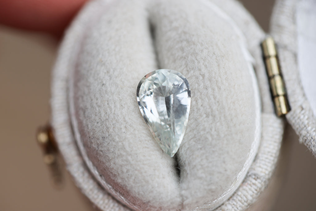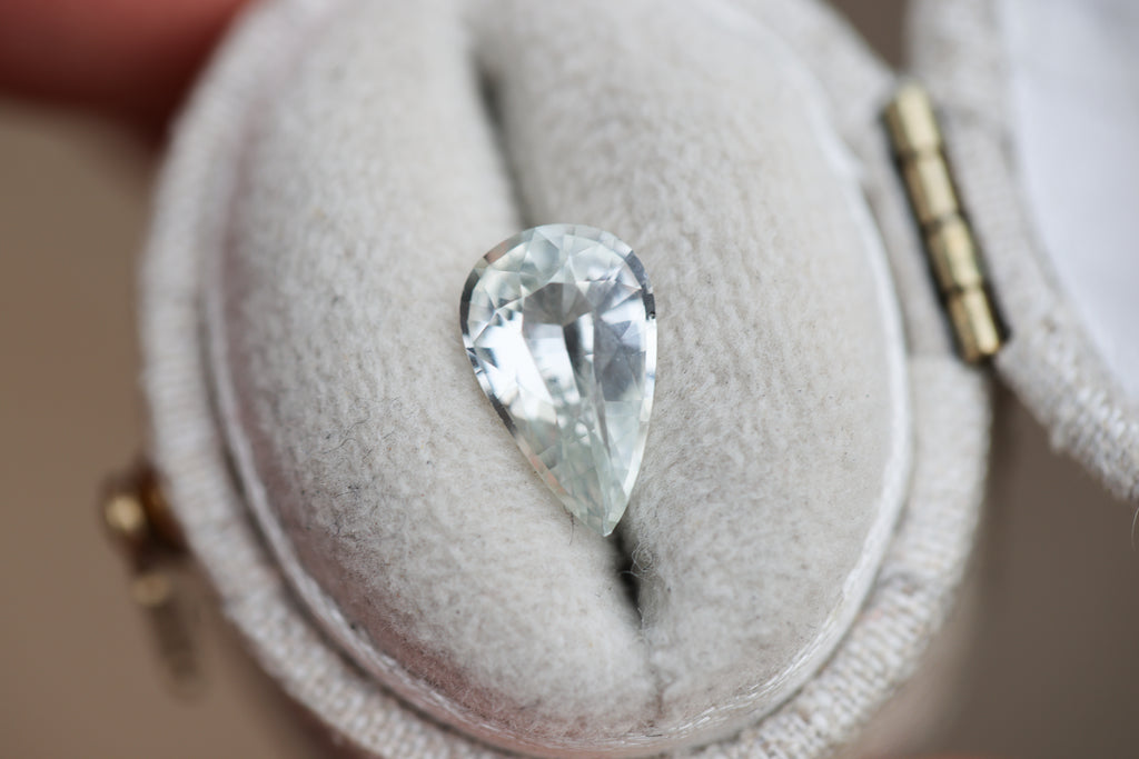 This absolutely stunning pear sapphire is an icy white with a touch of mint! Just a gorgeous stone!