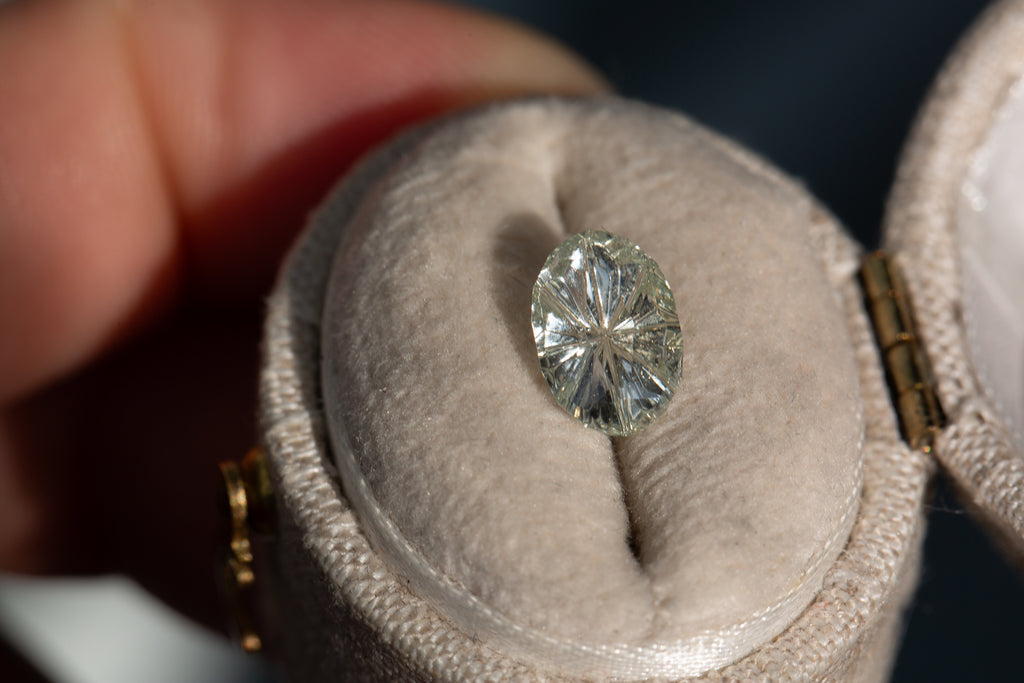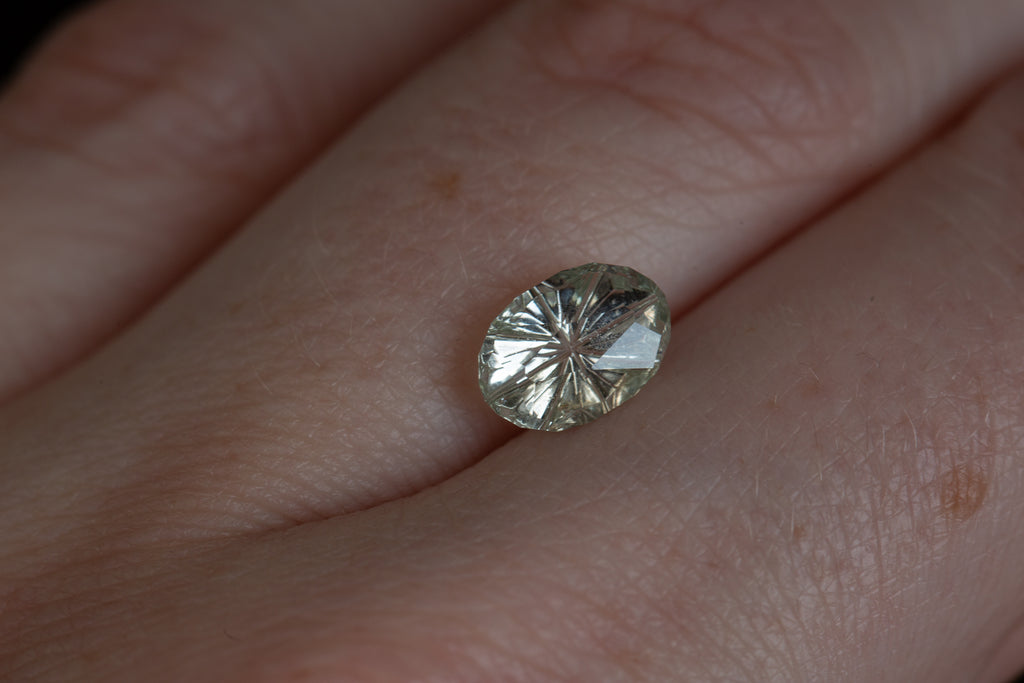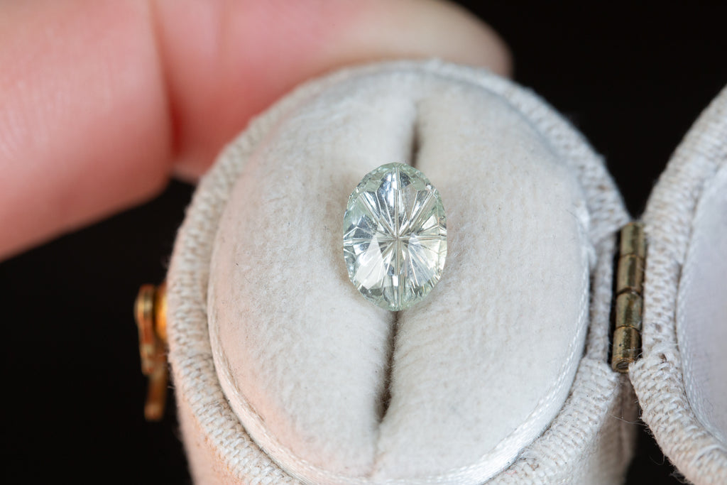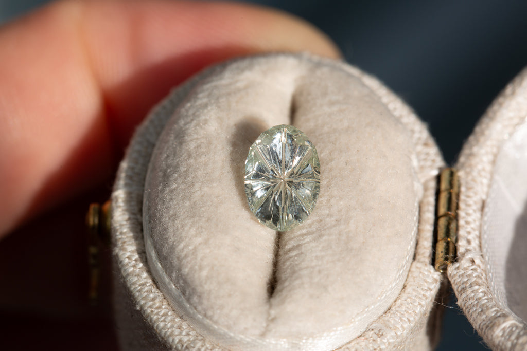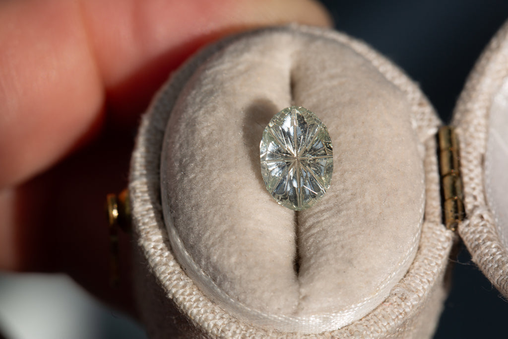 This absolutely stunning oval white sapphire has just a hint of color and a ton of wow factor! It is a custom Starbrite cut from award winning gem cutter John Dyer and will make just the most gorgeous piece!