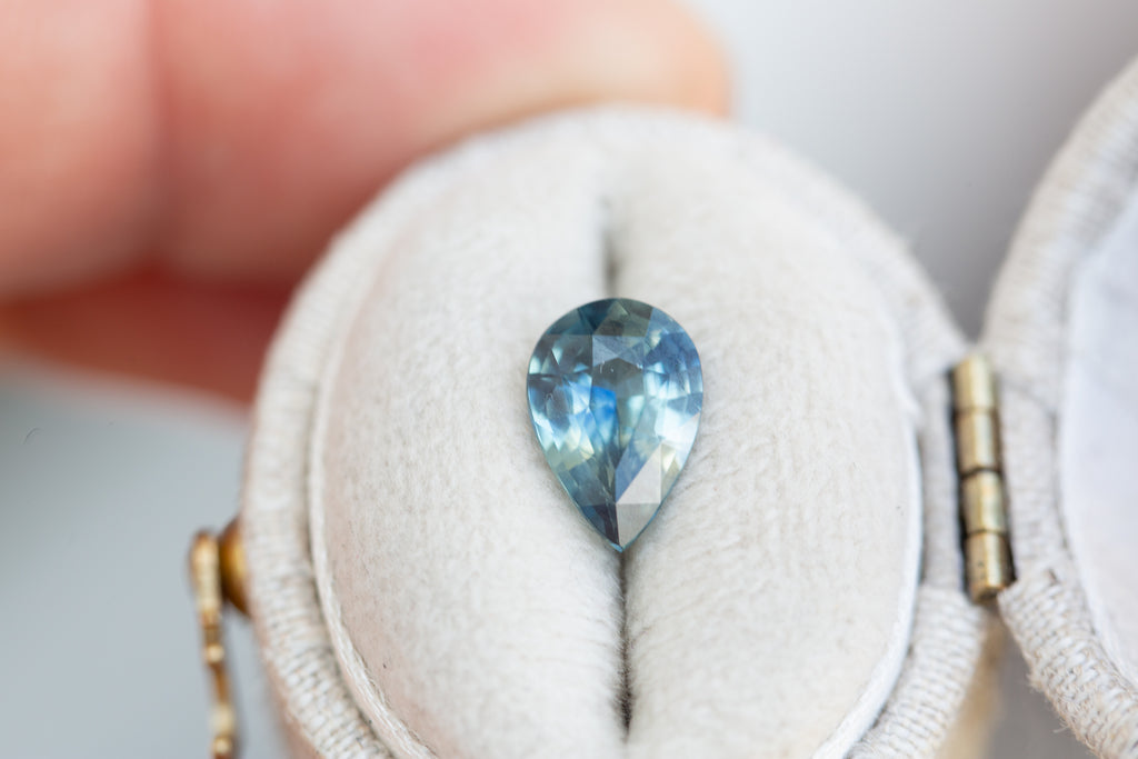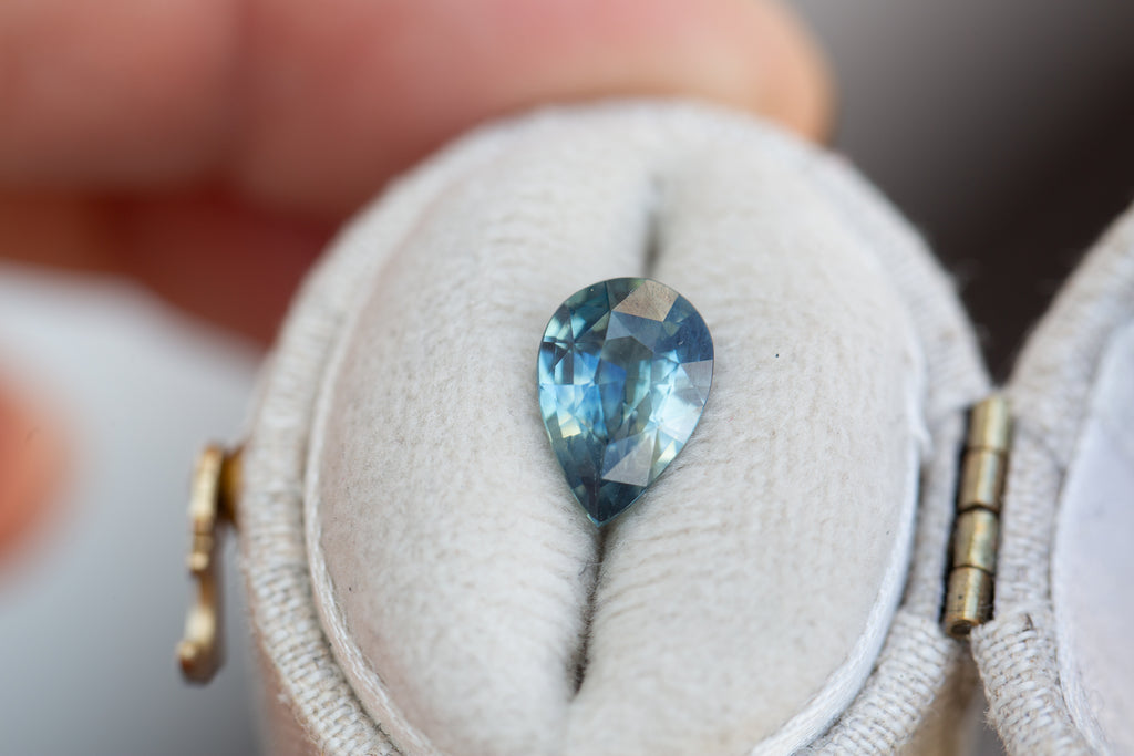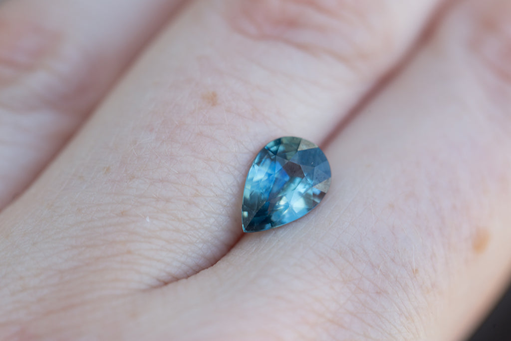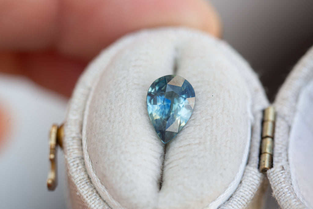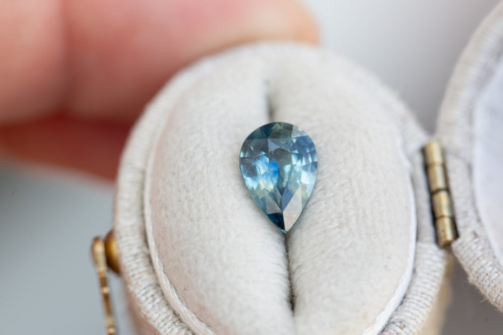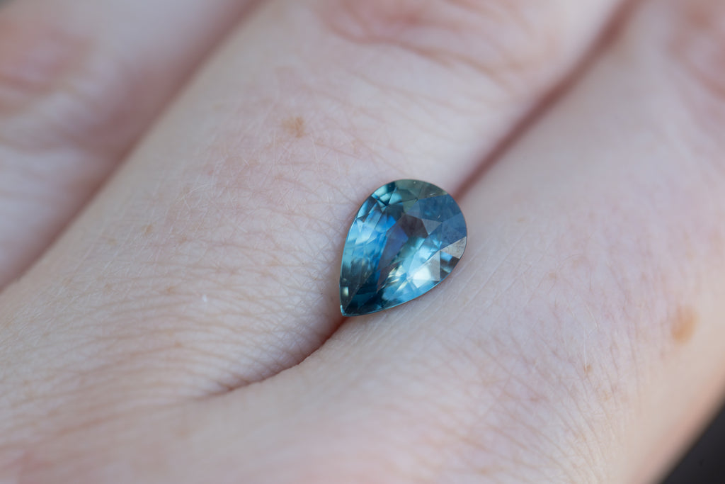 This absolutely gorgeous pear sapphire has the most incredible coloring! The way the light dances off the facets give such dimension to the many blue teal hues!