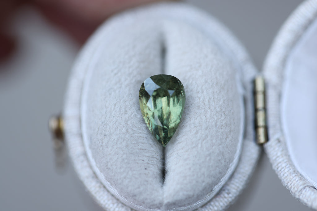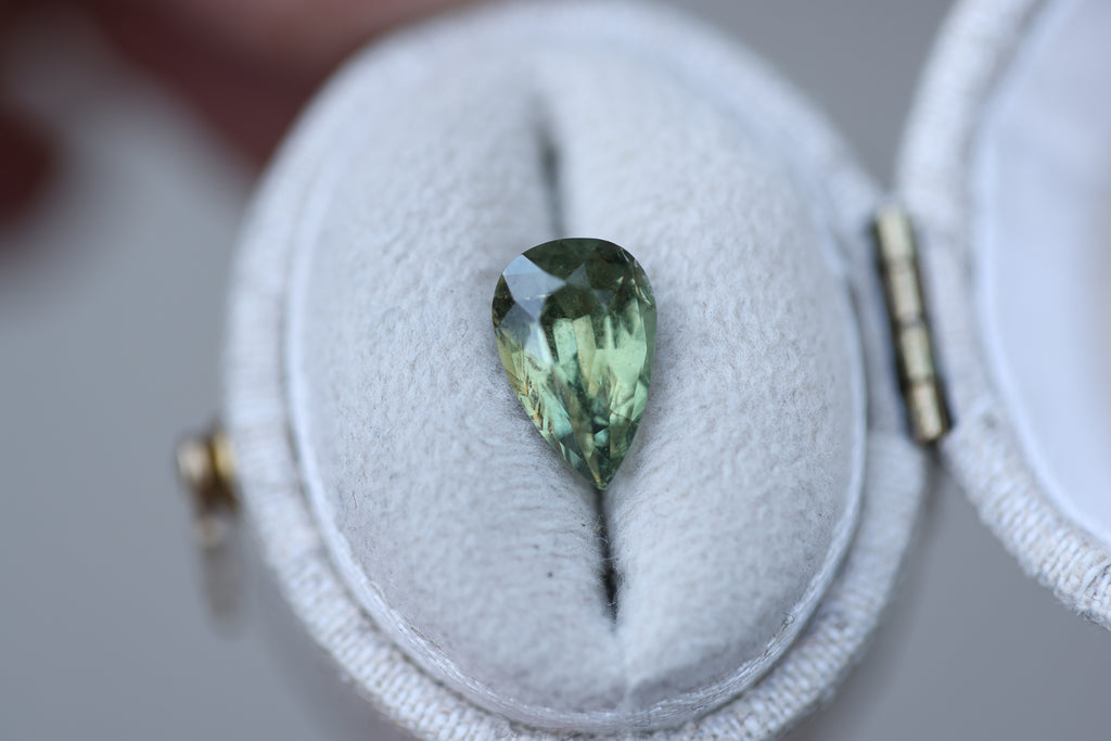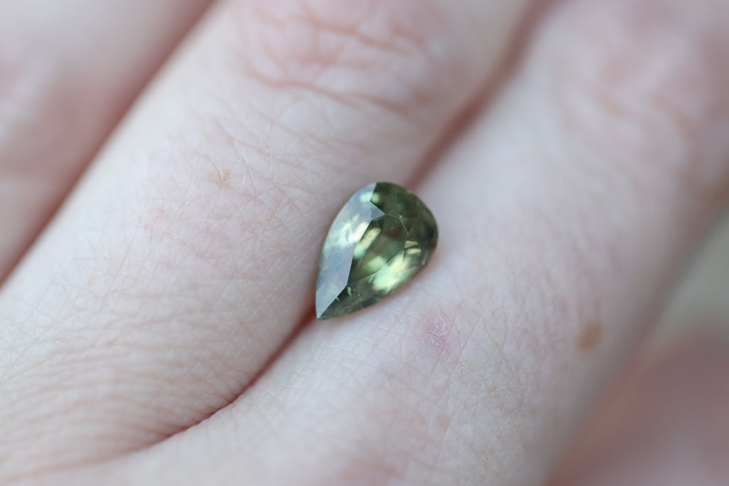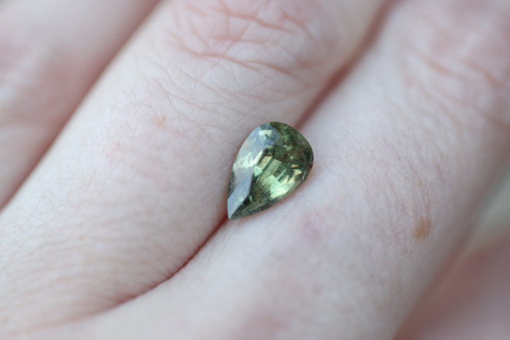 This absolutely incredible pear green sapphire is just a stunner! It has some really striking inclusions that make it such a unique and special stone! This stone shifts quite a bit in color from green to a almost khaki color.