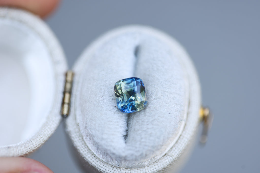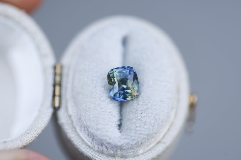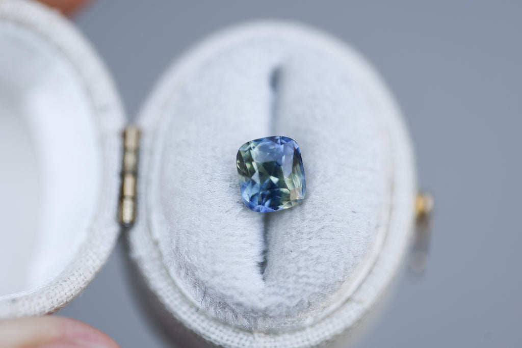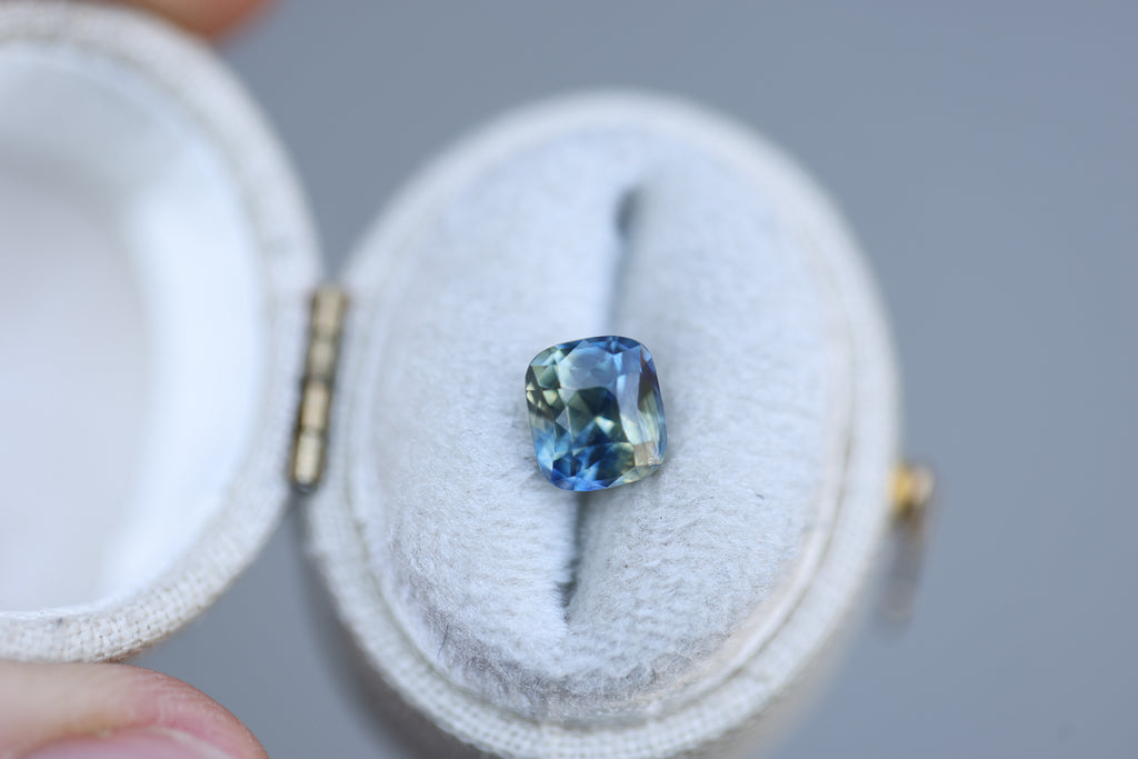 This super unique parti sapphire has stunning teal, yellow, and green coloring and features a square/cushion cut mix.