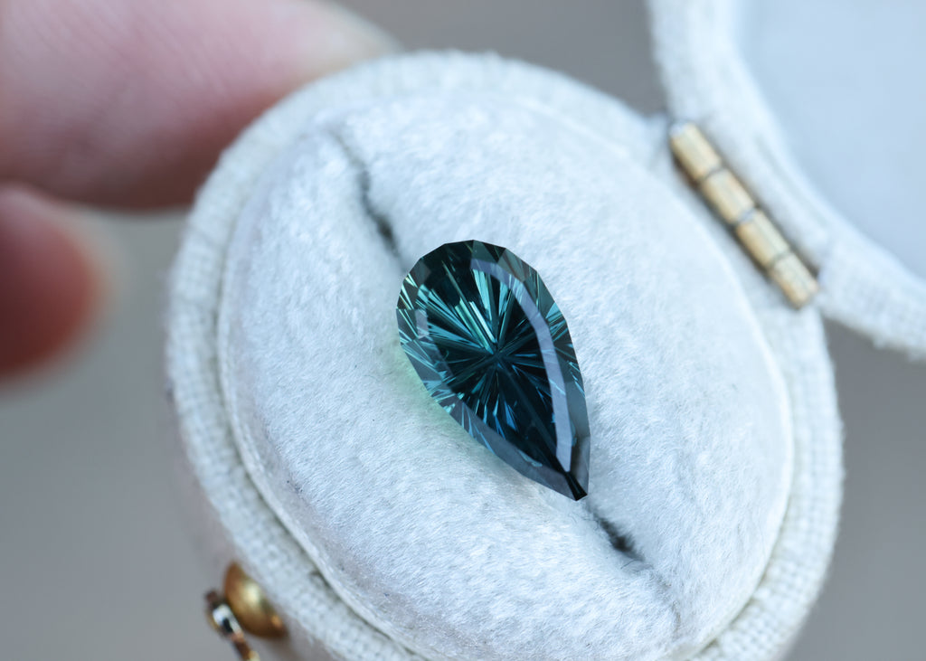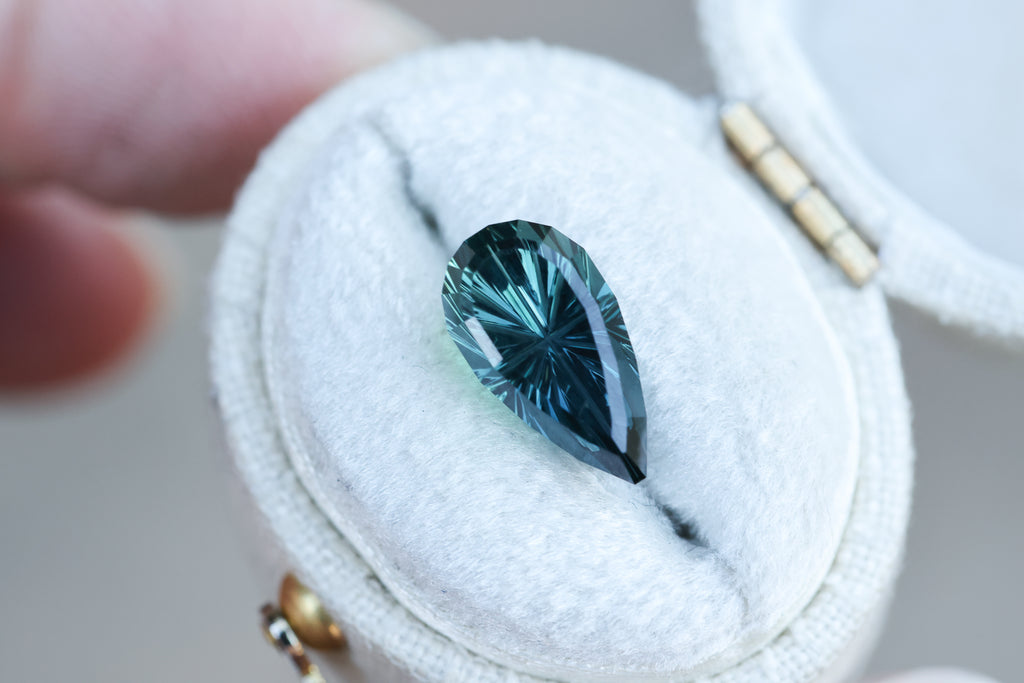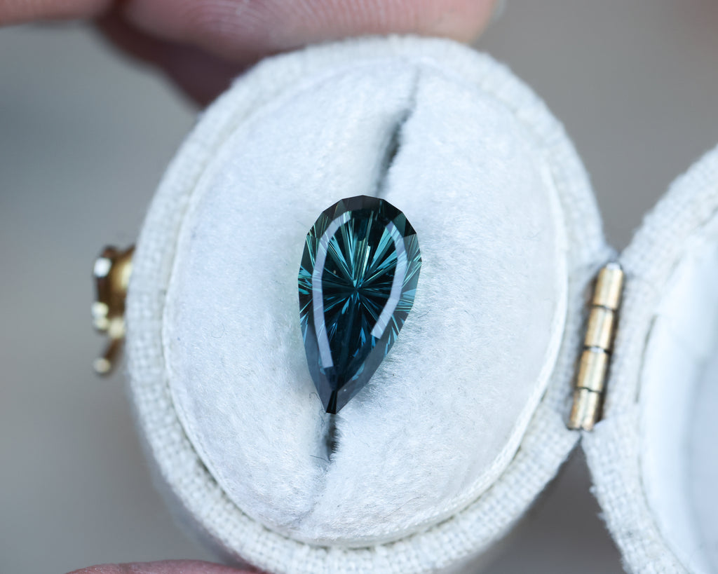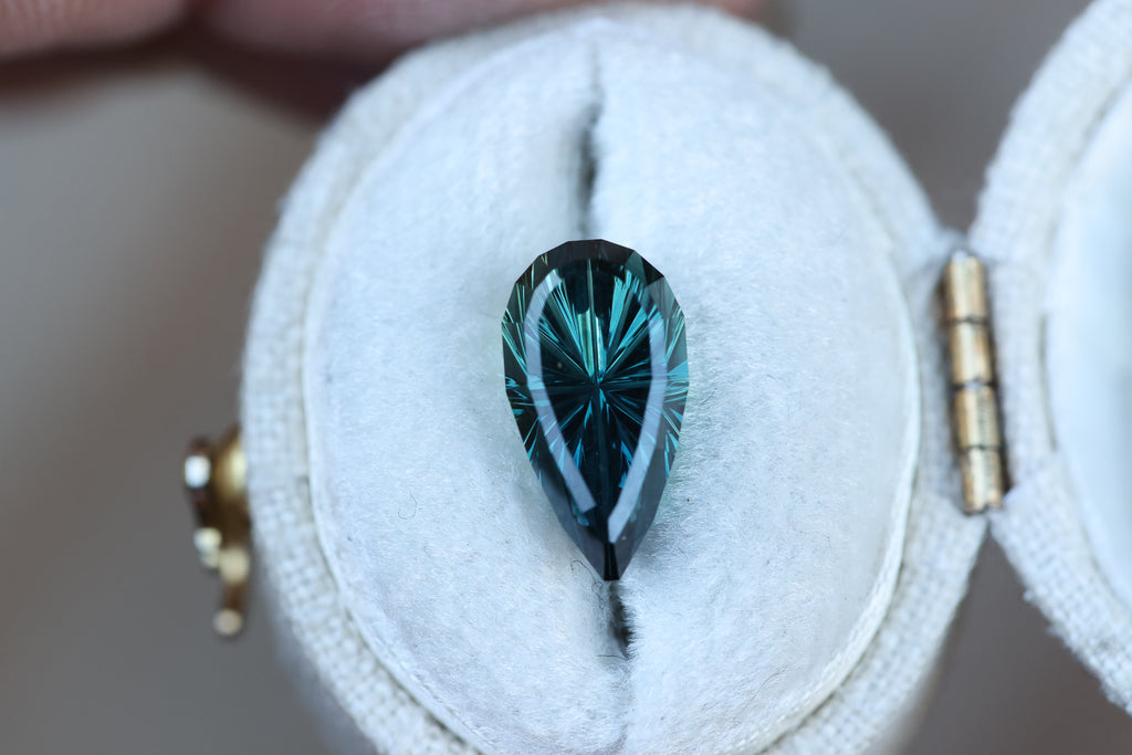 This absolutely STUNNING deep teal blue sapphire is a custom Starbrite cut by award winning gem cutter John Dyer! The dimension of color across its faceting is just magical! These pear Starbrite sapphires are so, so incredibly special and make the most gorgeous one of a kind rings!