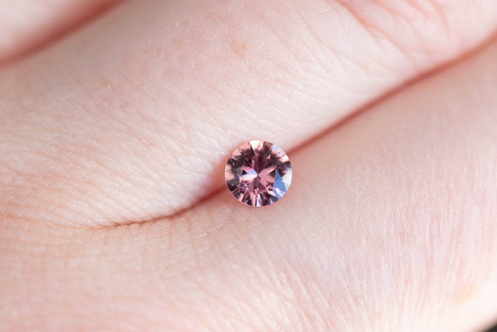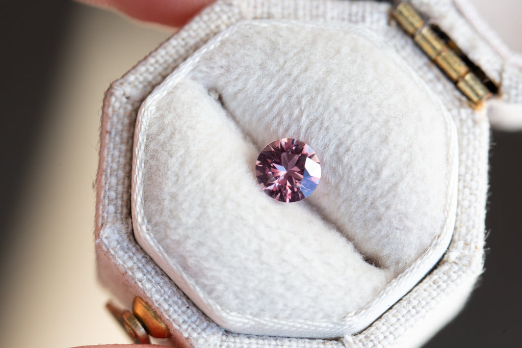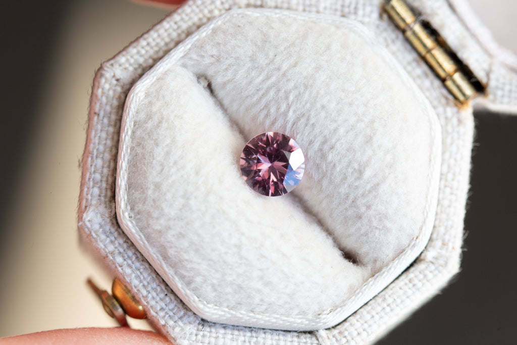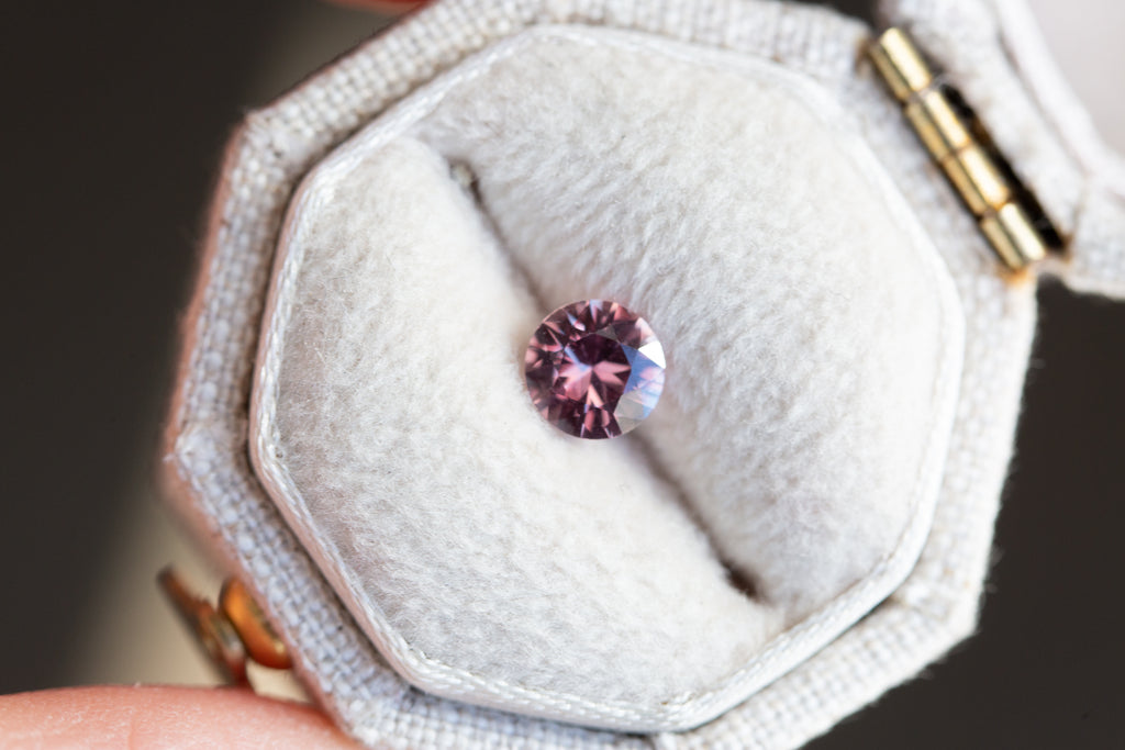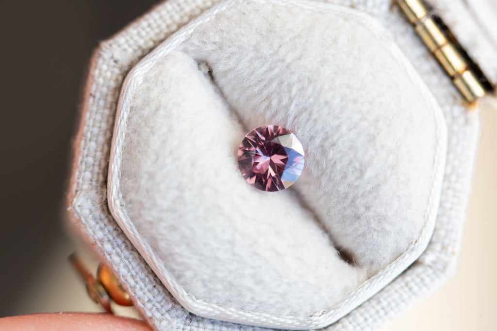 This gorgeous round sapphire is the prettiest red mauve color with lots of faceting for some incredible sparkle!