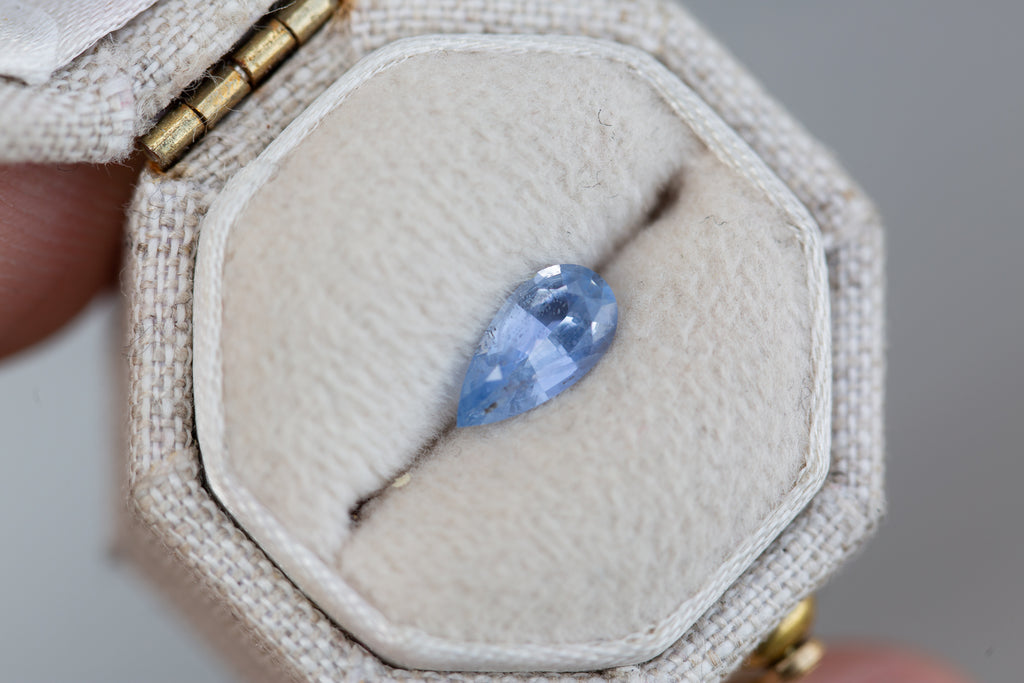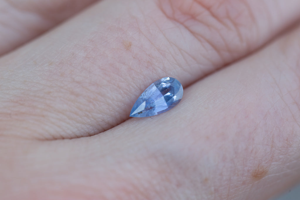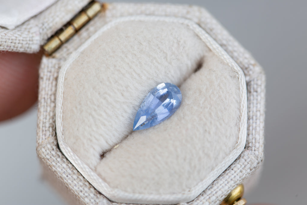 This beautiful opaque lighter/medium blue has the prettiest elongated pear shape!