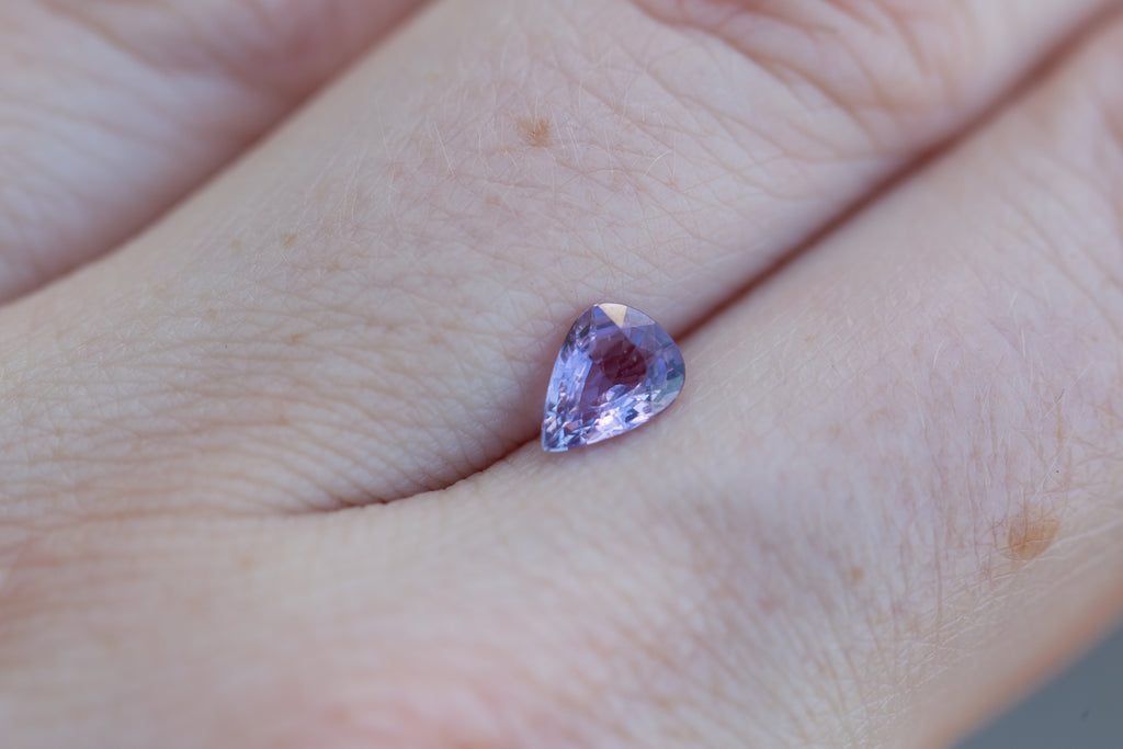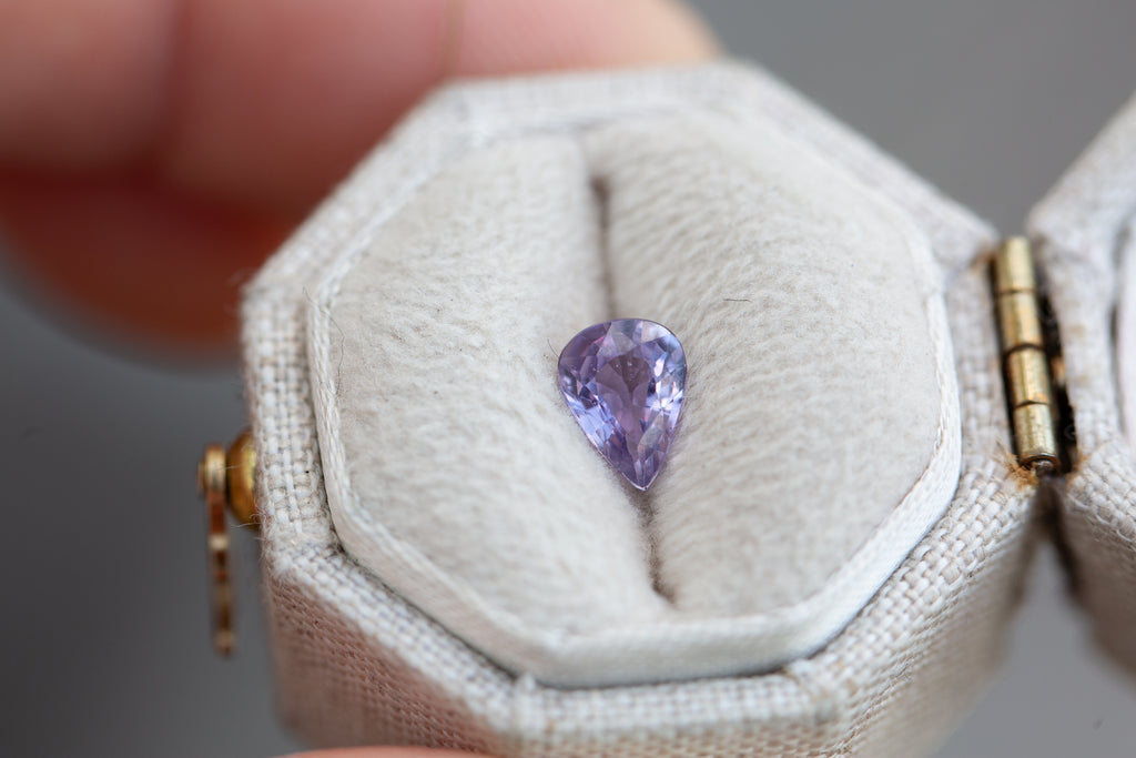 This is such a pretty pear sapphire with lovely purple coloring and sparkle!