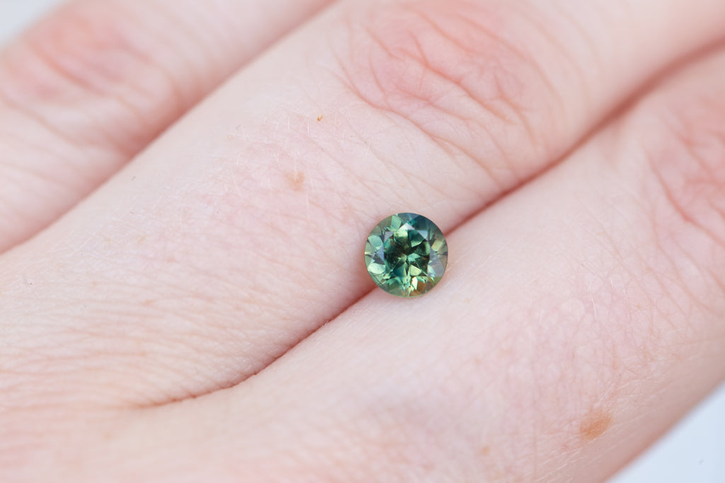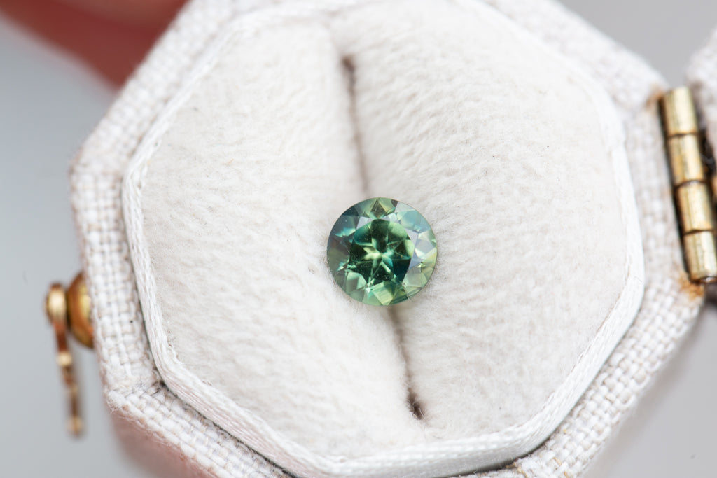 This beautiful round sapphire has the prettiest teal green coloring that just pops in the sunlight!
