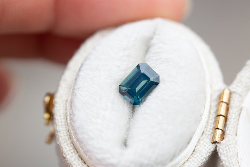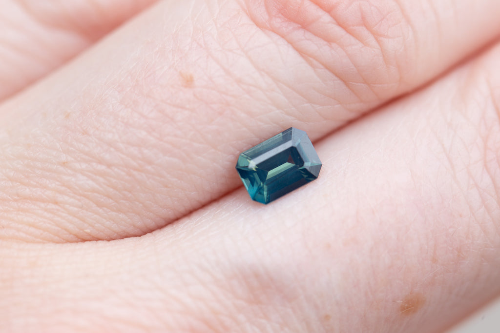 This stunning emerald cut sapphire is the most gorgeous moody opalescent blue teal!