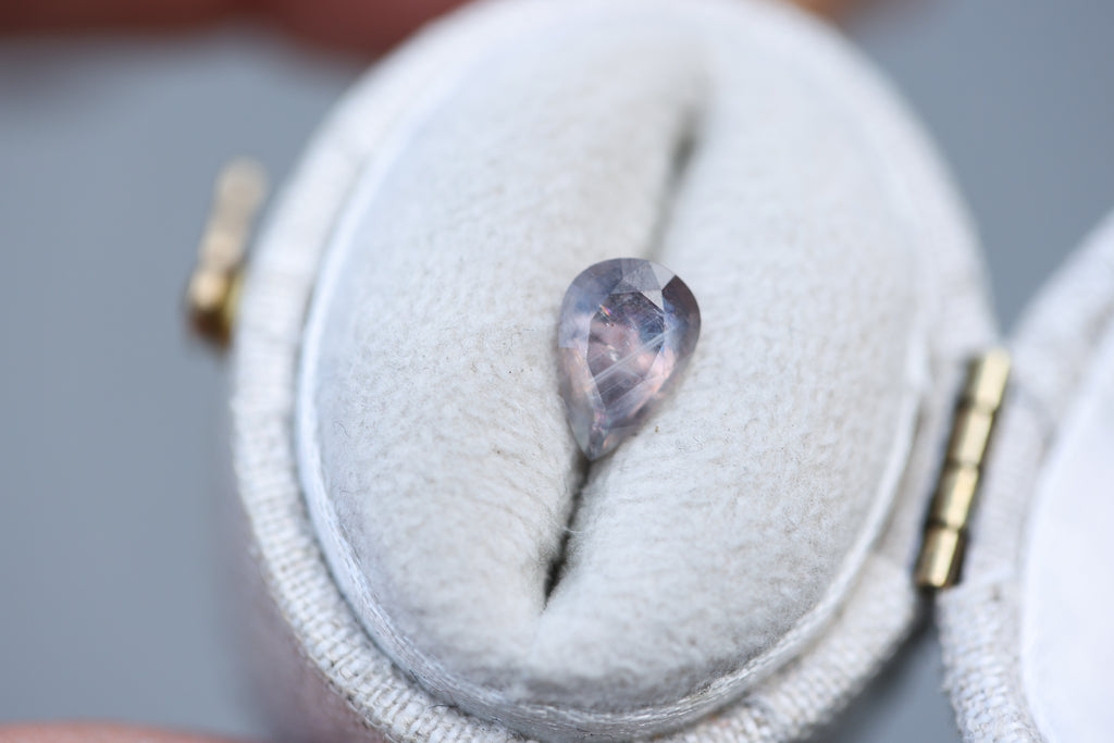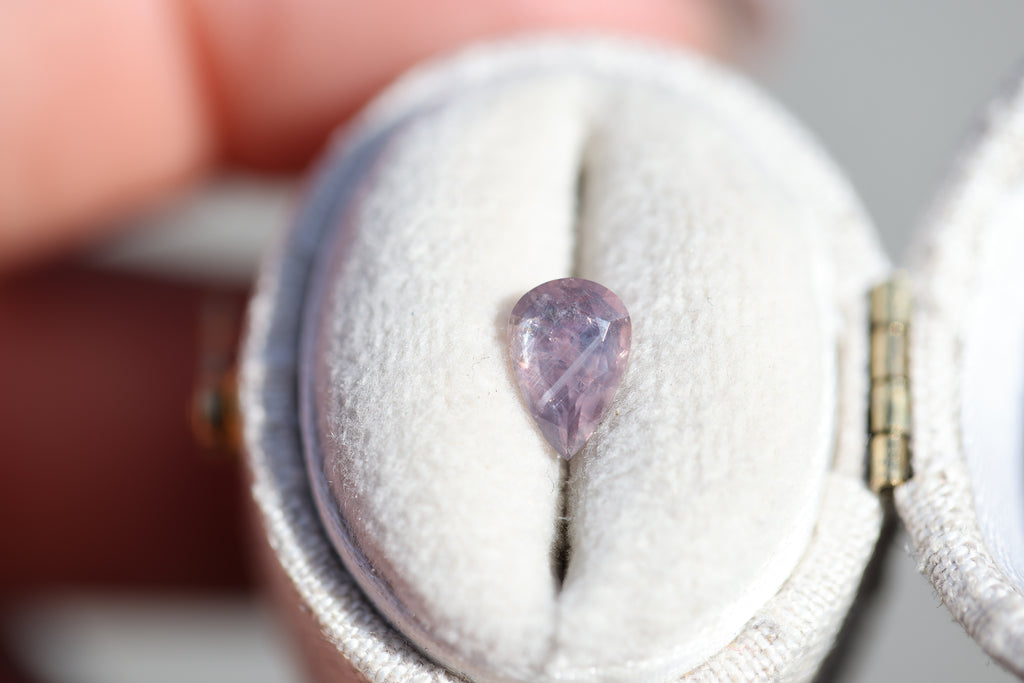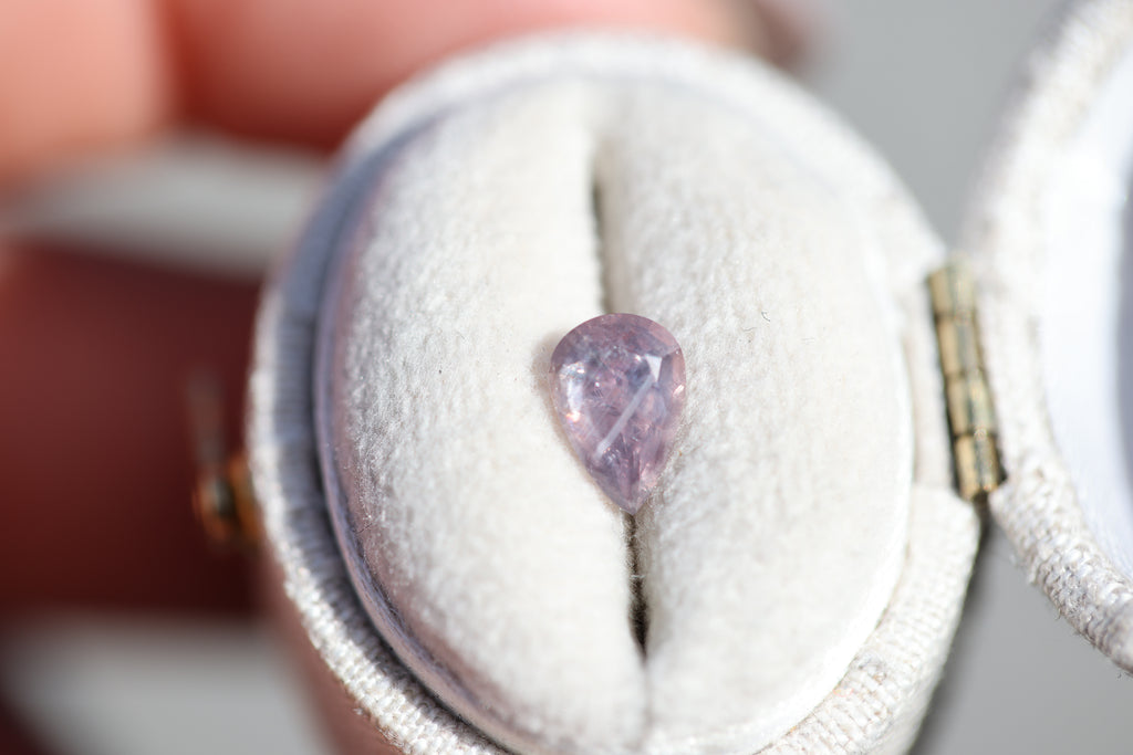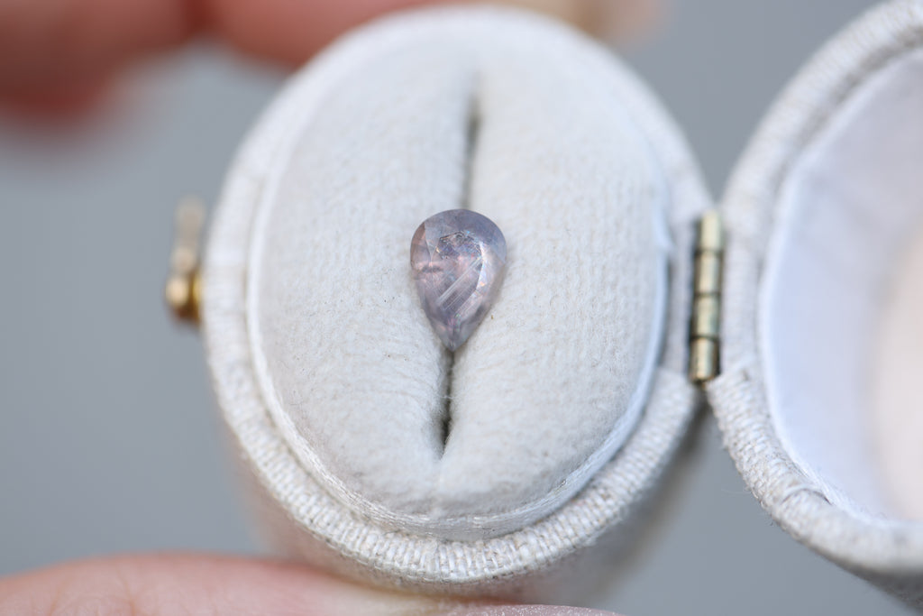 This gorgeous pear sapphire is so special! It has the loveliest pink/mauve coloring with tons of shimmery inclusions - just an absolute beauty!