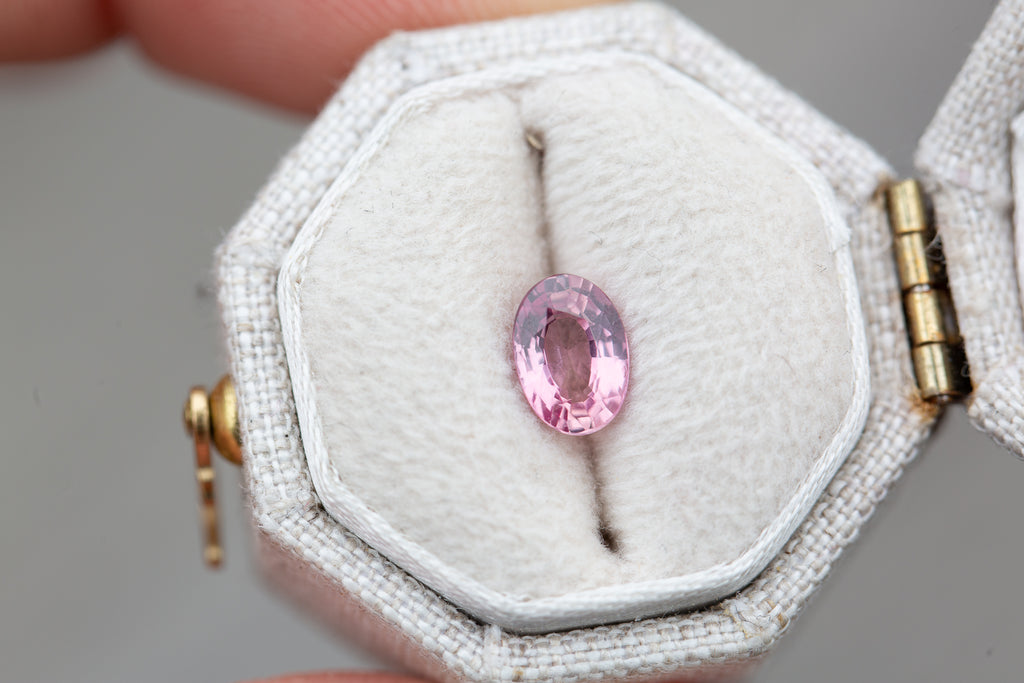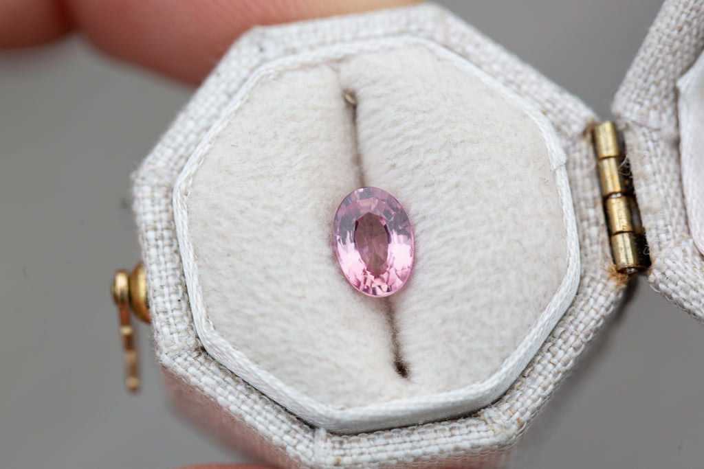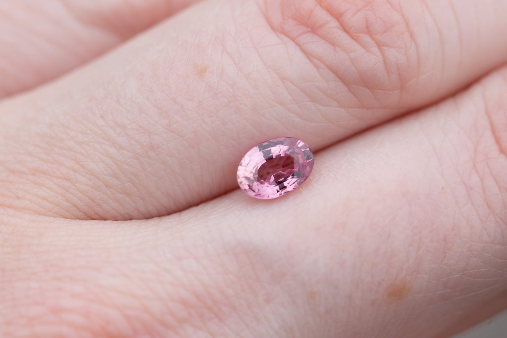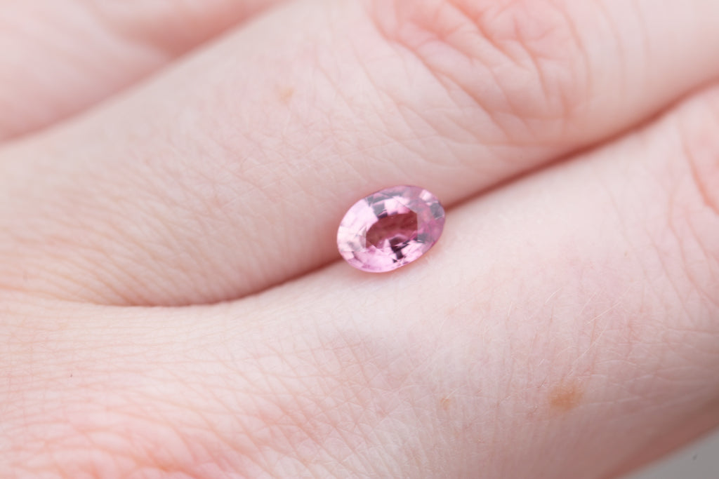 This lovely pink sapphire has a beautiful orange undertone and tons of sparkle!
