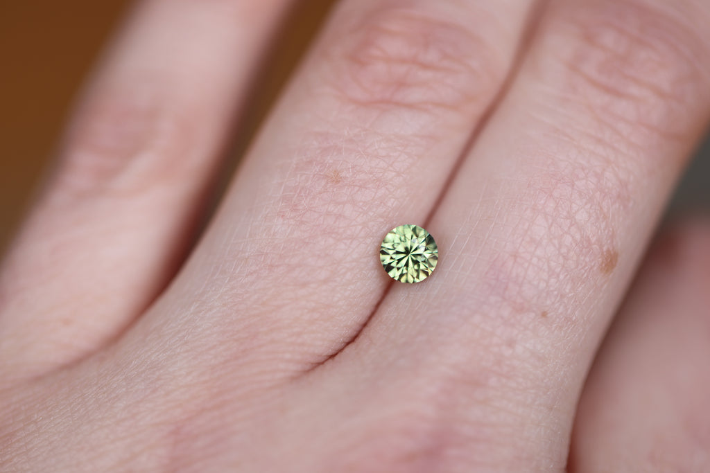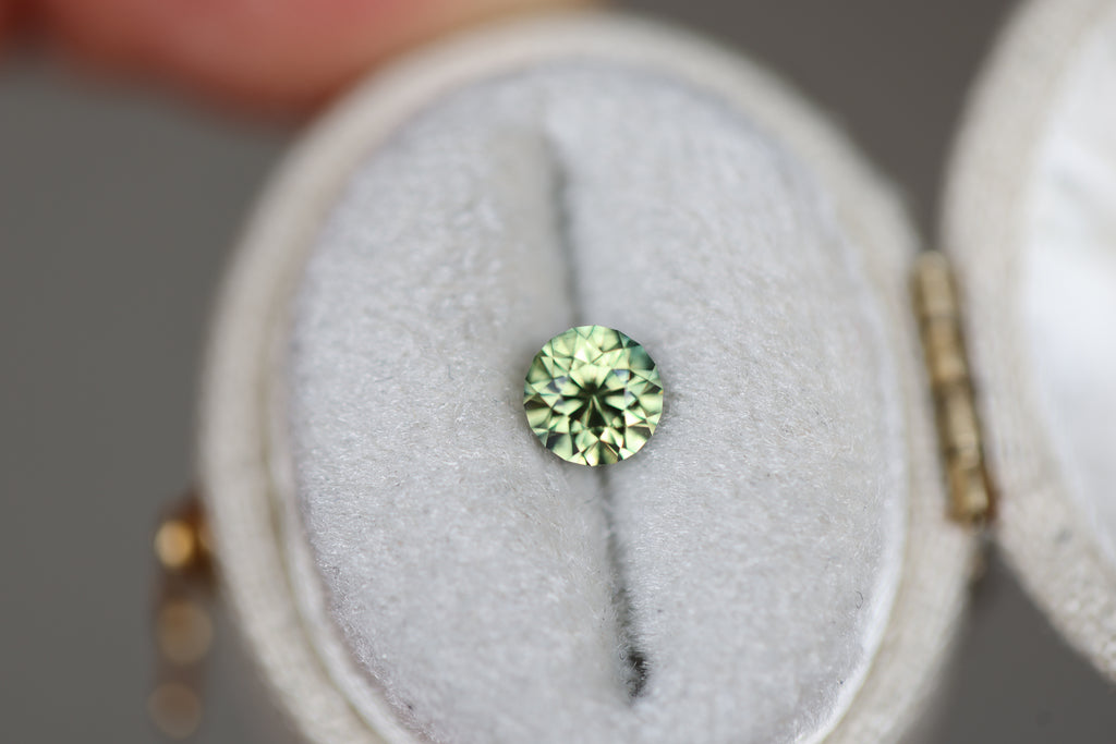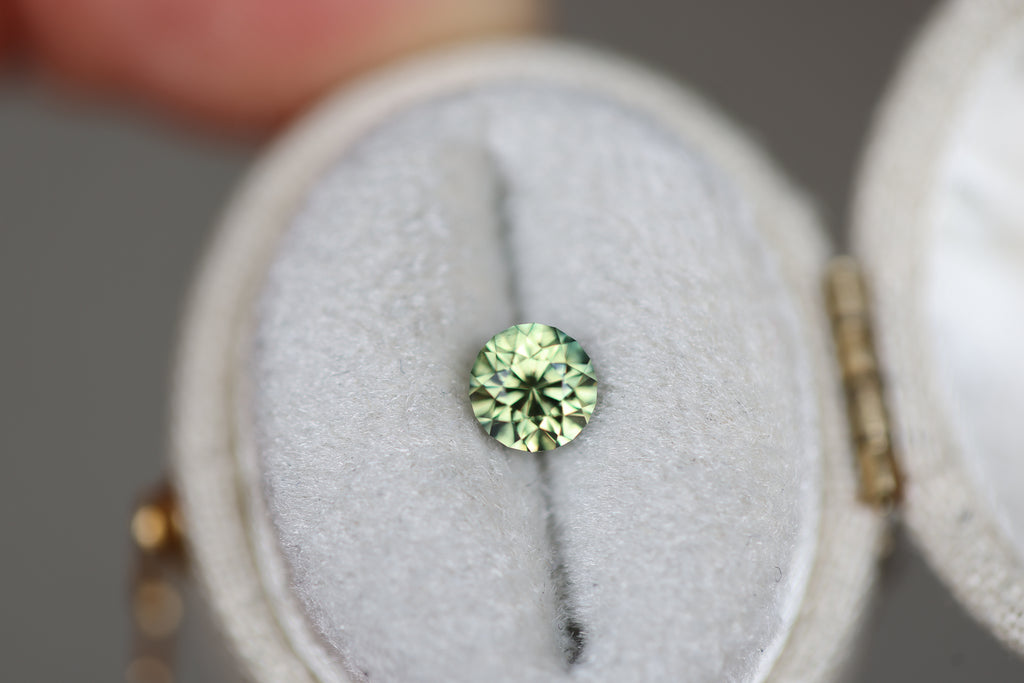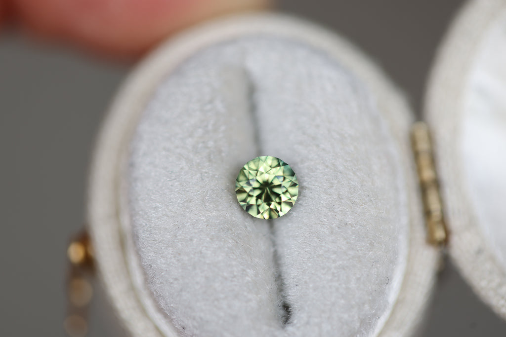 This incredible sapphire features a bright, vivid green color that dances off its custom Sunburst cut faceting by award winning gem cutter John Dyer!