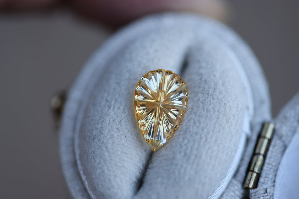 This absolutely gorgeous yellow pear Starbrite sapphire is just stunning! It has the loveliest custom Starbrite cut by award winning gem cutter John Dyer and is just such a special stone!
